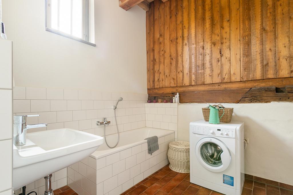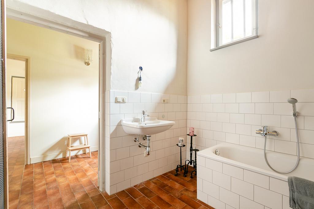 Badkamer met tegelvloer van ca. 8,5 m², voorzien van ligbad, inloopdouche met thermostaatkraan en wastafel. In de badkamer is een aansluiting voor wasmachine en -droger. Separaat toilet aanwezig met fontein.