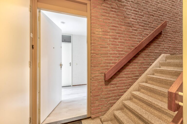 Centrale entree met brievenbussen en bellentableau. De hal geeft toegang tot de eigen berging, het trappenhuis en de afgesloten binnenplaats met de eigen parkeerplaats.