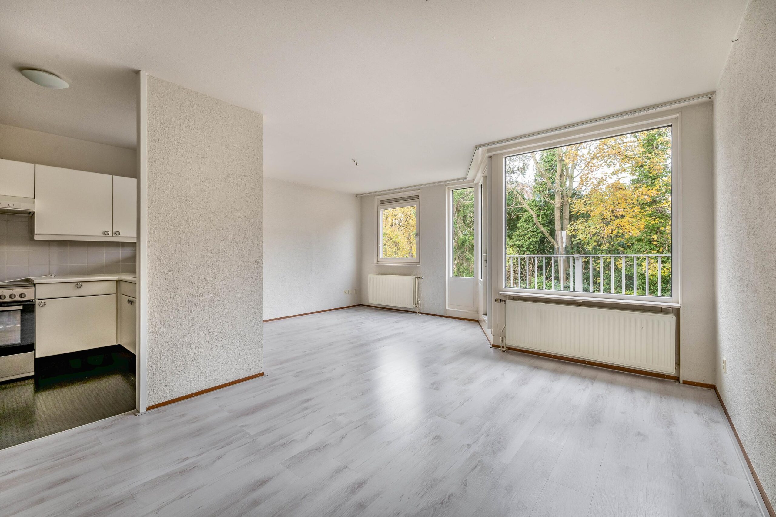 De woonkamer biedt directe toegang tot het balkon door middel van een loopdeur. Vanaf het balkon is er vrij uitzicht op het aanwezige groen. In de open keuken zijn een 4-pits gasfornuis met oven en afzuigkap aanwezig. De bijkeuken is voorzien van een tegelvloer, de cv-ketel, de witgoedaansluiting en een raam. Beide slaapkamers zijn ruim.