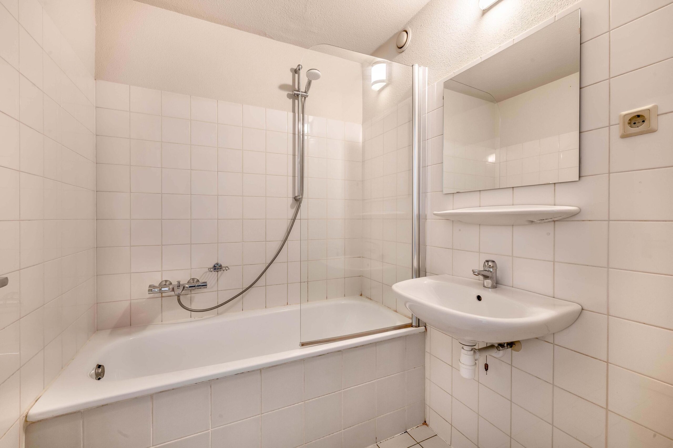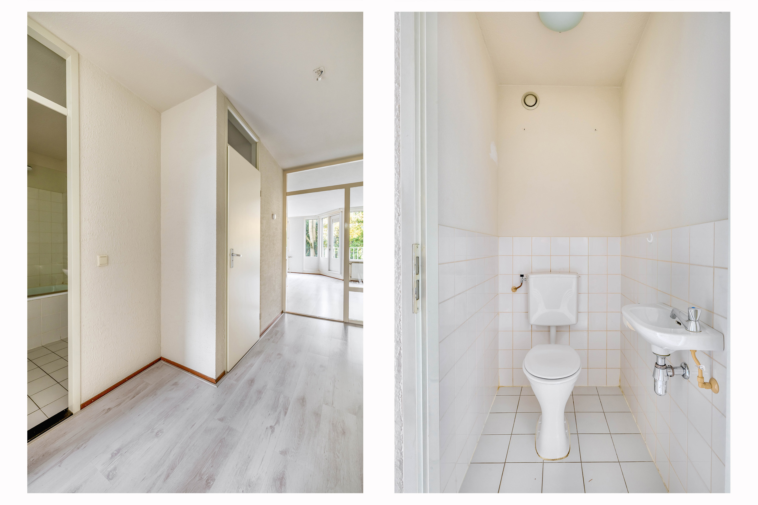 De ruime biedt toegang tot alle overige ruimtes. Het toilet is voorzien van een fonteintje. In de geheel betegelde badkamer zijn een ligbad met douche, wastafel en radiator aanwezig.