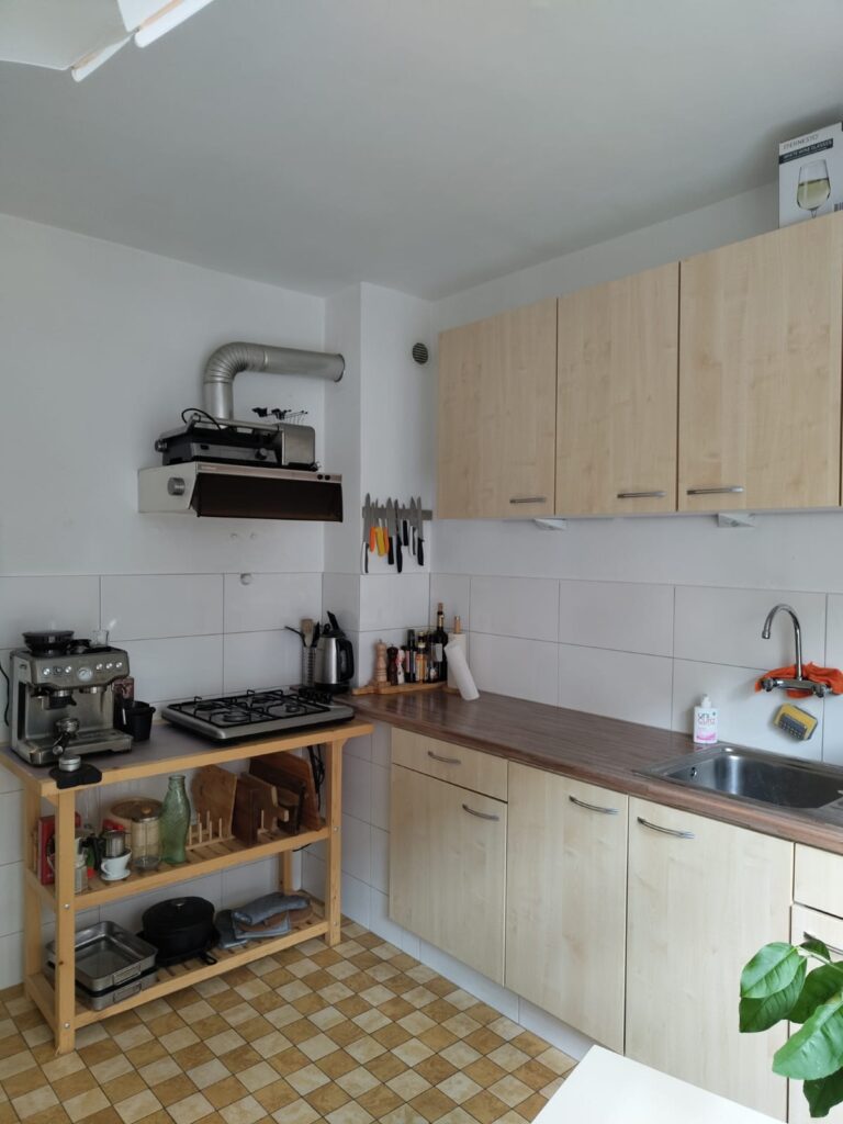 Ruime keuken (ca. 10 m²) met originele tegelvloer en afzuigkap.