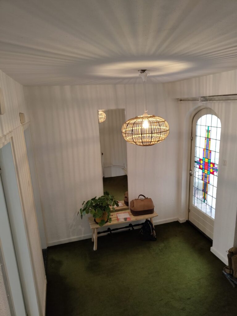 Authentieke entree/hal met toegang tot het half betegeld toilet met fonteintje, keuken, woonkamer en dakterras.