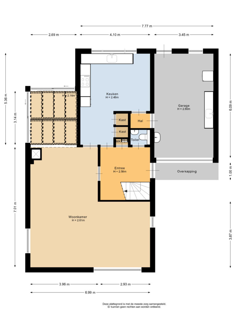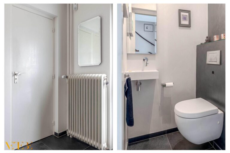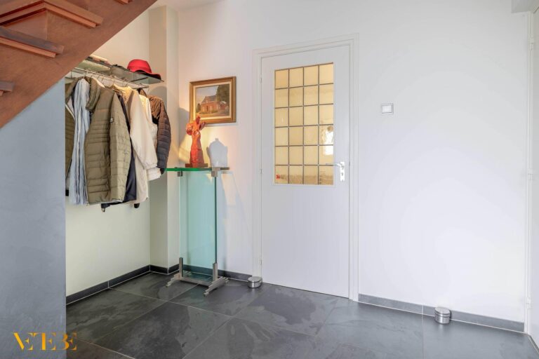 In de grote hal zijn een trapkast, garderobe, de meterkast en het toilet met fonteintje aanwezig. Er ligt een Braziliaanse leistenen vloer.