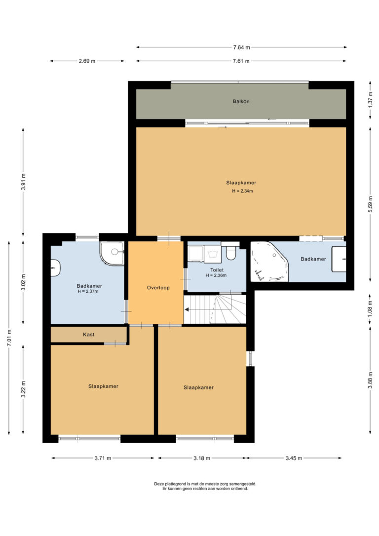 Vanuit de overloop zijn de wasruimte, de 3 slaapkamers en de badkamer bereikbaar. De grootste slaapkamer heeft een eigen en-suite badkamer.