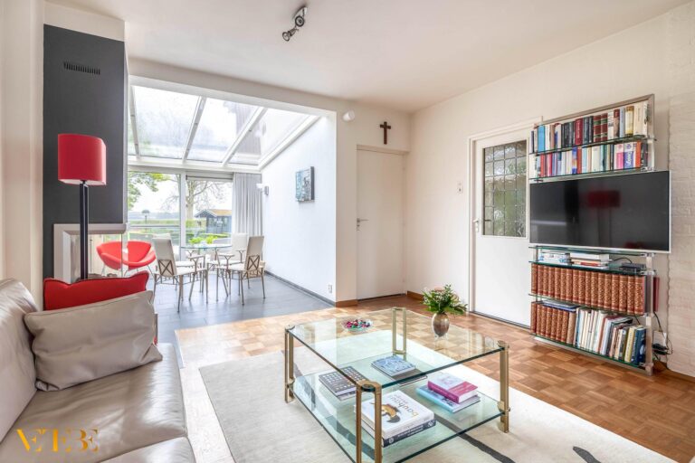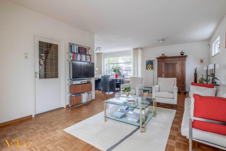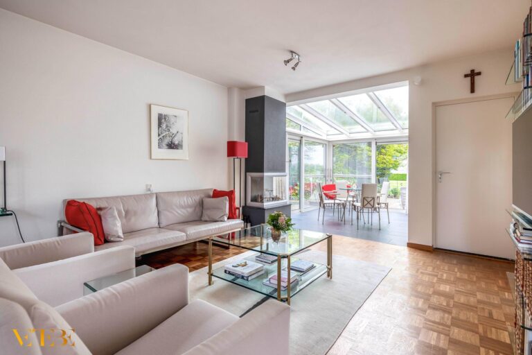 De L-vormige woonkamer (totaal is ca. 47m²) is voorzien van een houtenvloer en veel natuurlijke lichtinval. De gashaard is te bedienen met een afstandsbediening. Vanuit de serre is er een prachtig uitzicht over de eigen achtertuin. In de serre ligt dezelfde Braziliaanse leistenen vloer als in de hal. Hier is het pluspunt de vloerverwarming. Twee schuifpuien bieden direct toegang tot de achtertuin. Het glazen dak zorgt ook in de serre voor een mooie natuurlijke lichtinval.