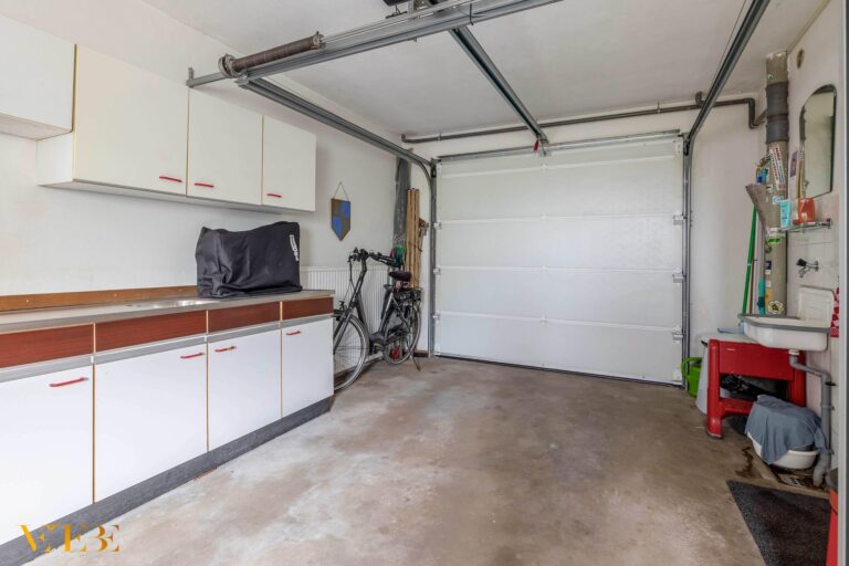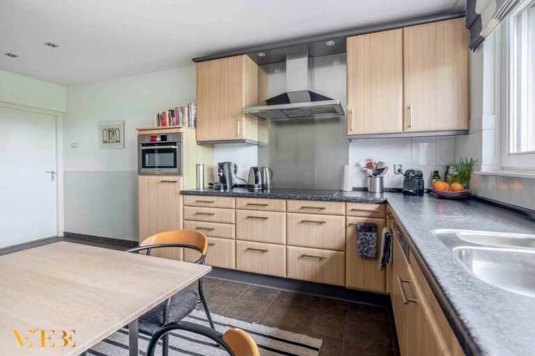 De leefkeuken (ca. 18m²) is voorzien van een tegelvloer. De keuken is uitgerust met een inductiekookplaat, afzuigkap, combi oven/magnetron, vaatwasser en koelkast. Ook vanuit de keuken is er een prachtig uitzicht over de eigen achtertuin. De keuken heeft ten slotte nog twee muurkasten. Het tussenportaal biedt toegang tot de inpandige garage (ca. 21m²) met elektrische poort, elektra, water en verwarming. Een loopdeur biedt toegang tot de achtertuin.