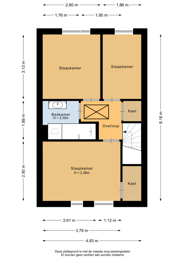 Op de verdieping ligt een doorlopende laminaatvloer. Op de overloop bevindt zich een handige bergkast. Er zijn 3 slaapkamers (ca. 6m², 8,5m² en 11m²) aanwezig.