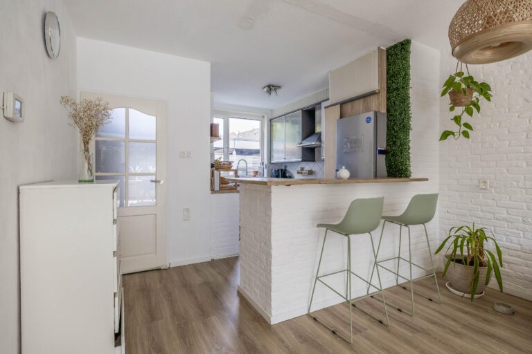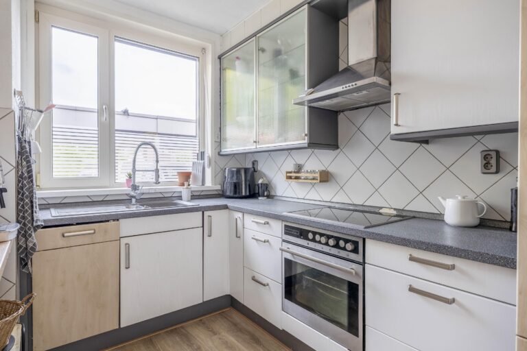 Aan de straatzijde bevindt zich de open keuken met onder andere een inductiekookplaat, afzuigkap, vaatwasmachine en oven.