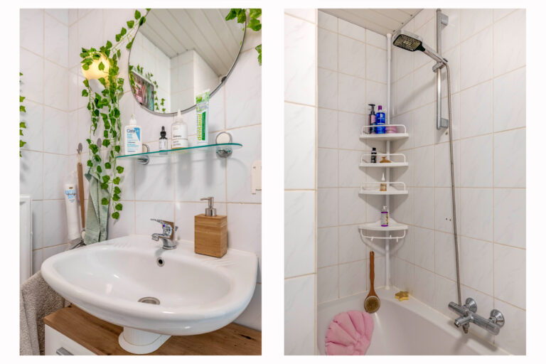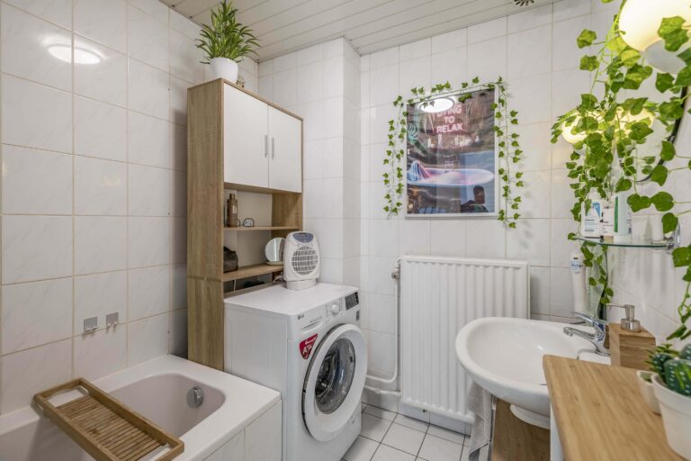 De geheel betegelde badkamer (ca. 4m²) is voorzien van een ligbad met douche, wastafelmeubel en witgoedaansluiting.