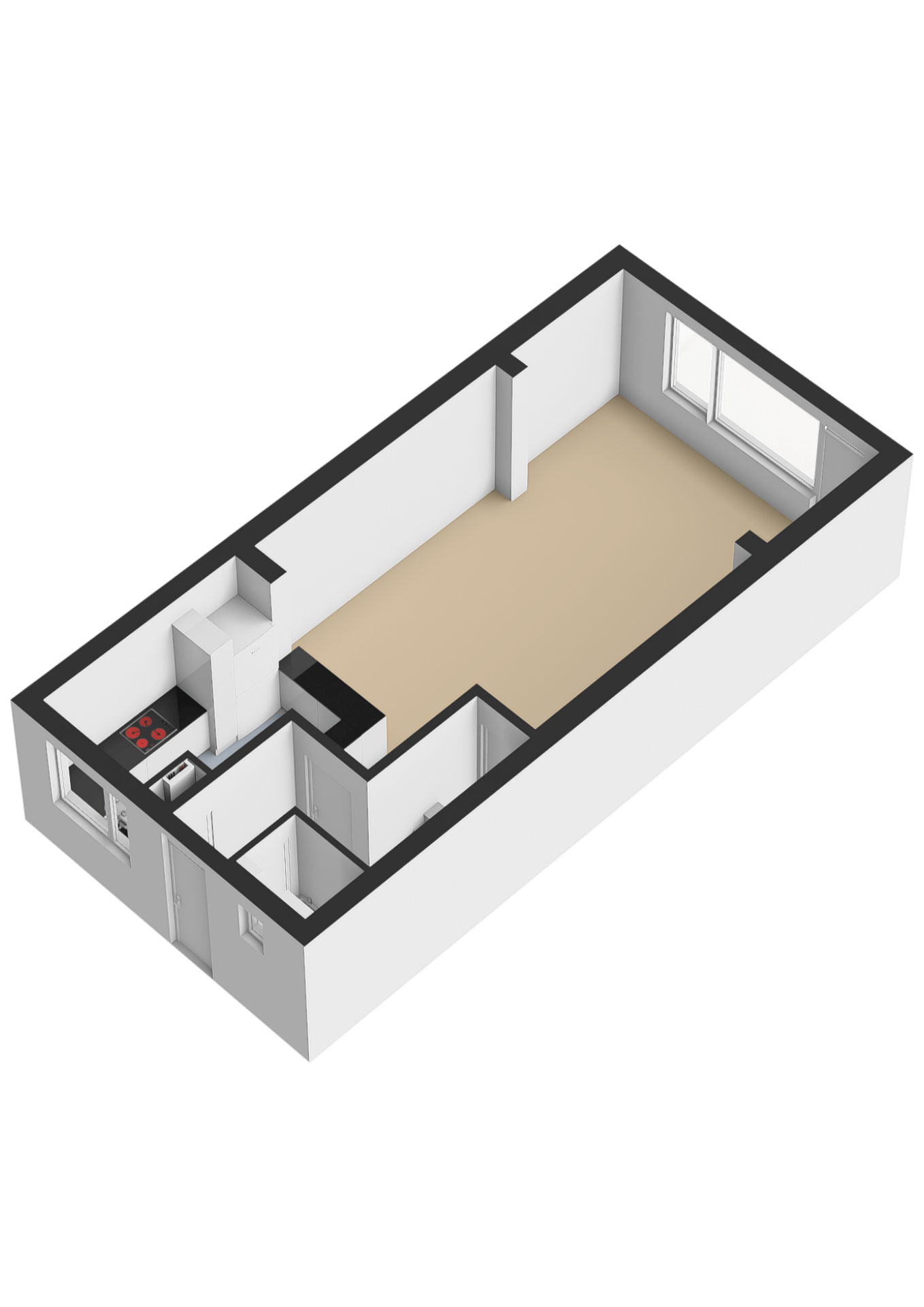 Aan de straatzijde bevindt zich de open keuken met onder andere een inductiekookplaat, afzuigkap, vaatwasmachine en oven.