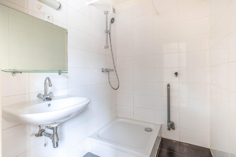 Via een kleine hal zijn de slaapkamer en de badkamer toegankelijk. De slaapkamer beschikt over een vaste kast met de cv-ketel en een loopdeur naar het dakterras. De volledig betegelde badkamer is voorzien van een douche, wastafel en mechanische ventilatie.