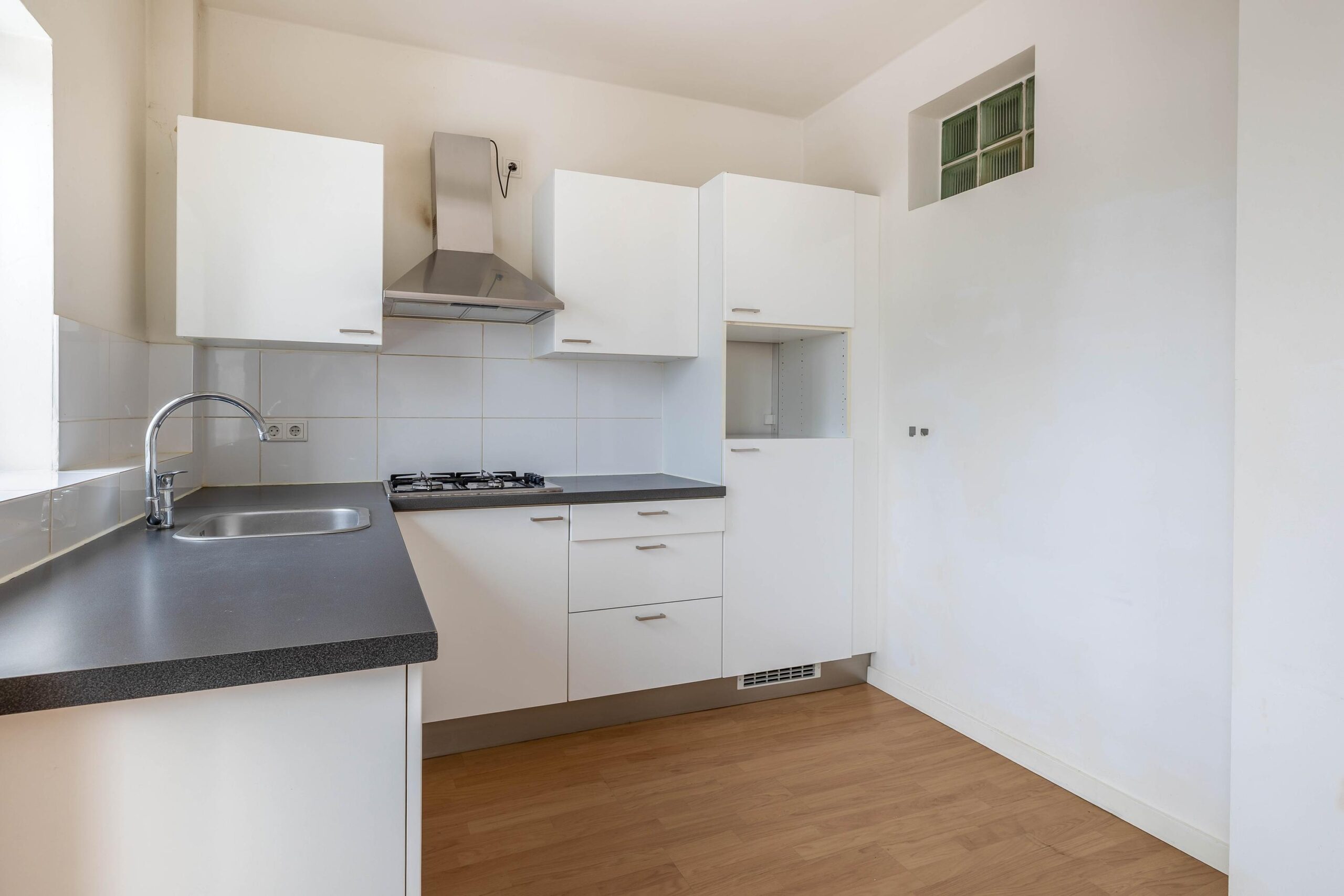 De ruime woonkamer heeft een fijne lichtinval door de grote ramen aan de voorzijde en de loopdeur naar het dakterras. Aan de voorzijde van de woonkamer bevindt zich de open keuken, uitgerust met een 4-pits gaskookplaat, afzuigkap en koelkast.