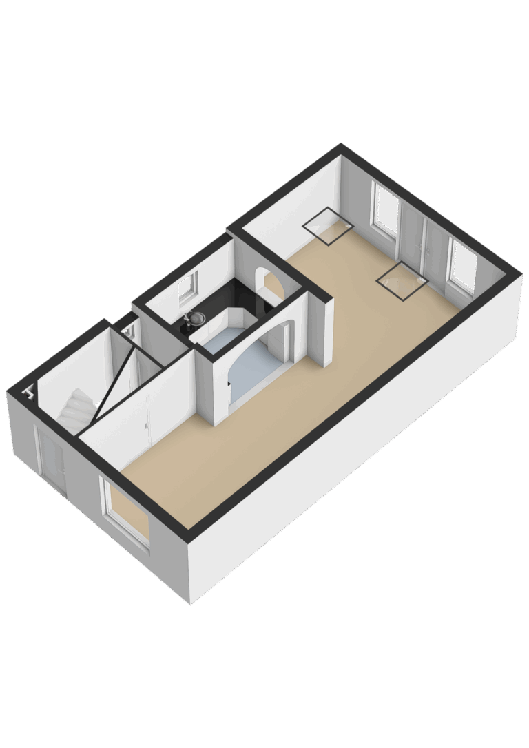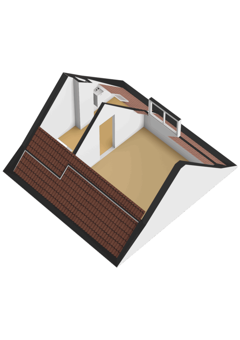 De zolderverdieping is een volwaardige, ruime kamer met een dakkapel. Hier zijn een klein dakraam (enkel glas) en de cv-ketel aanwezig.