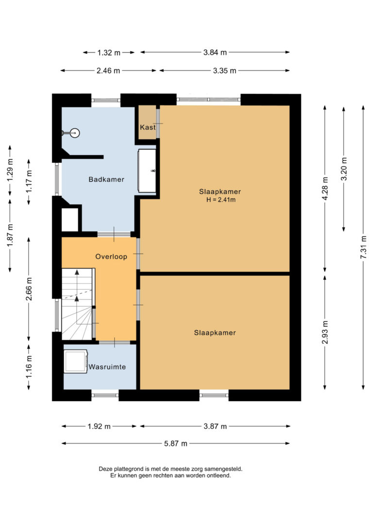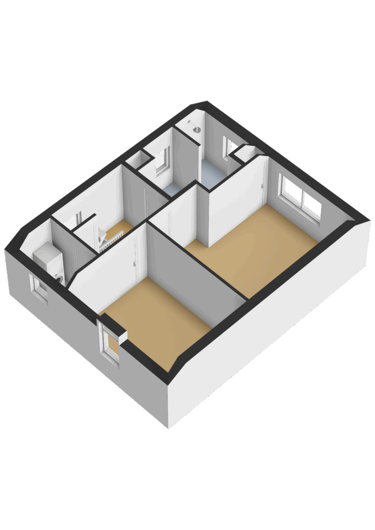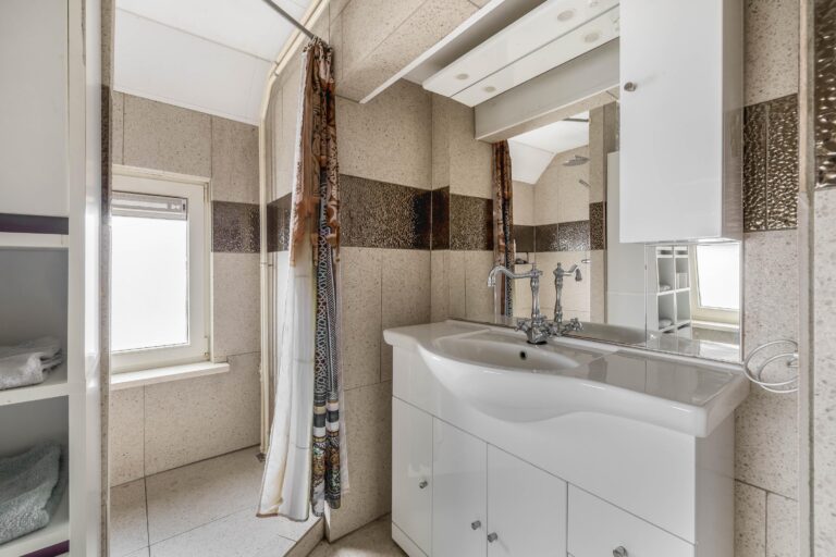 Verder zijn er een aparte wasruimte met witgoedaansluitingen en een geheel betegelde badkamer met wastafelmeubel, douche en raam aanwezig.