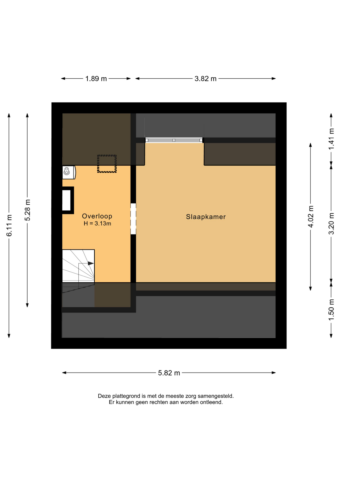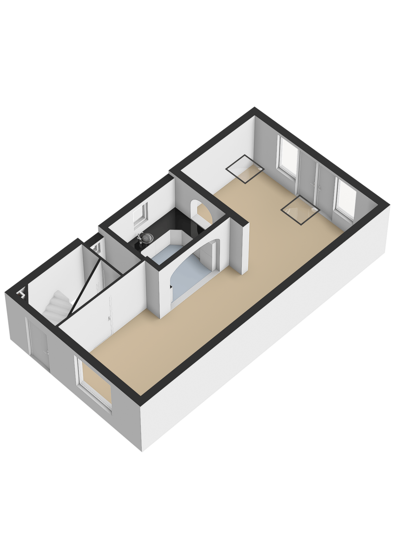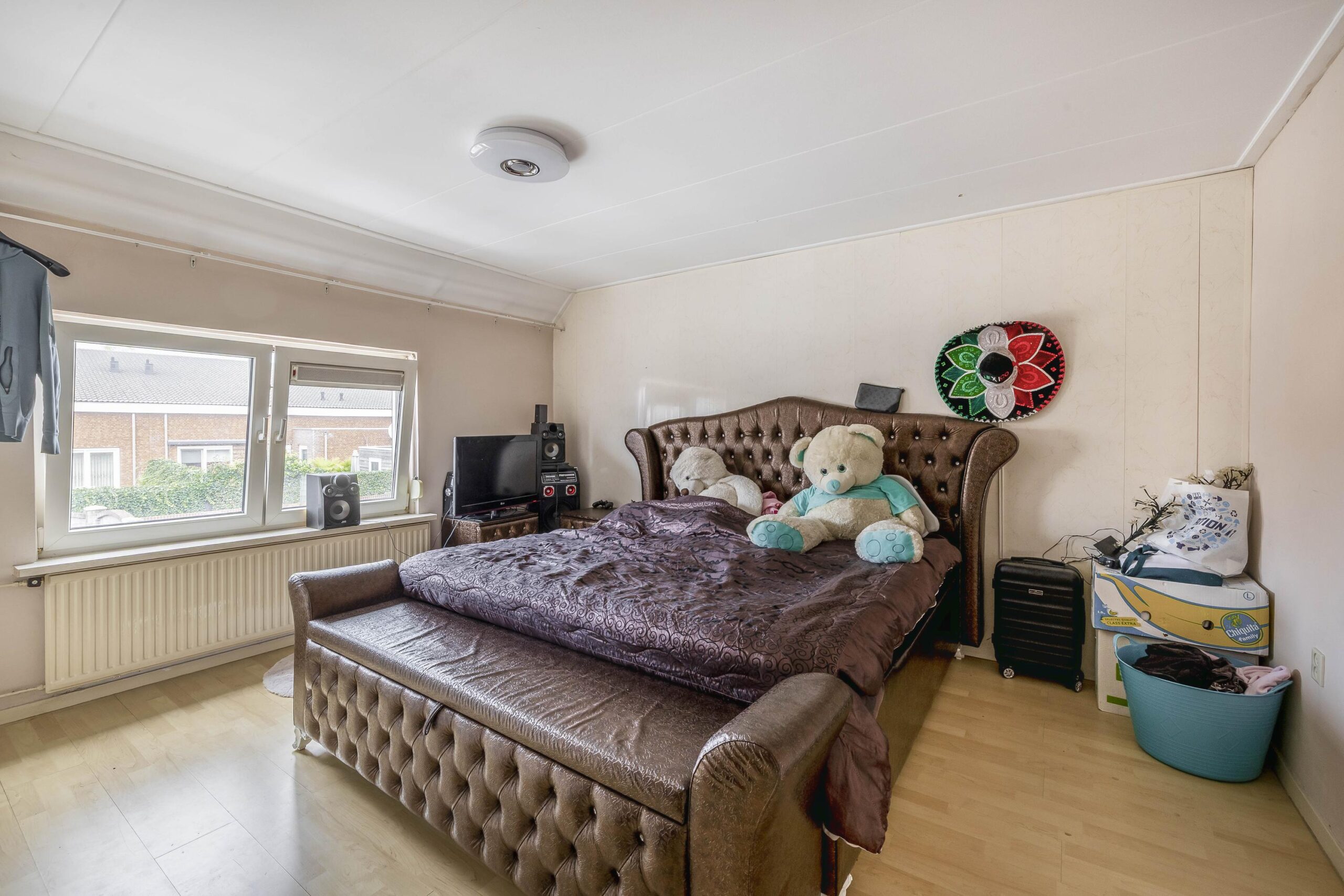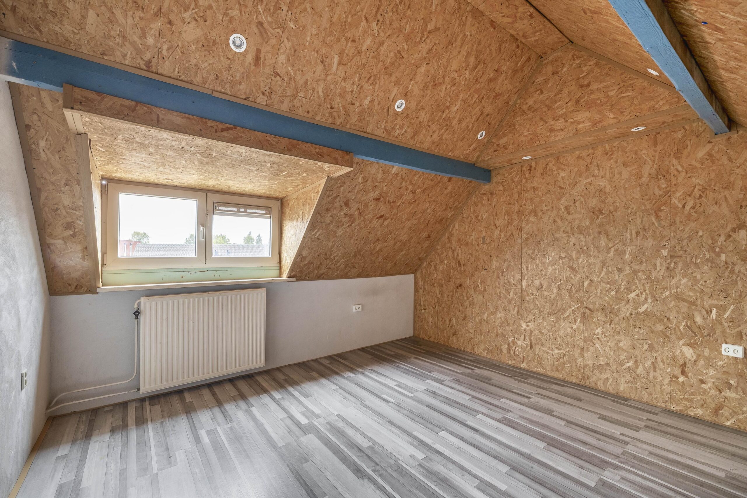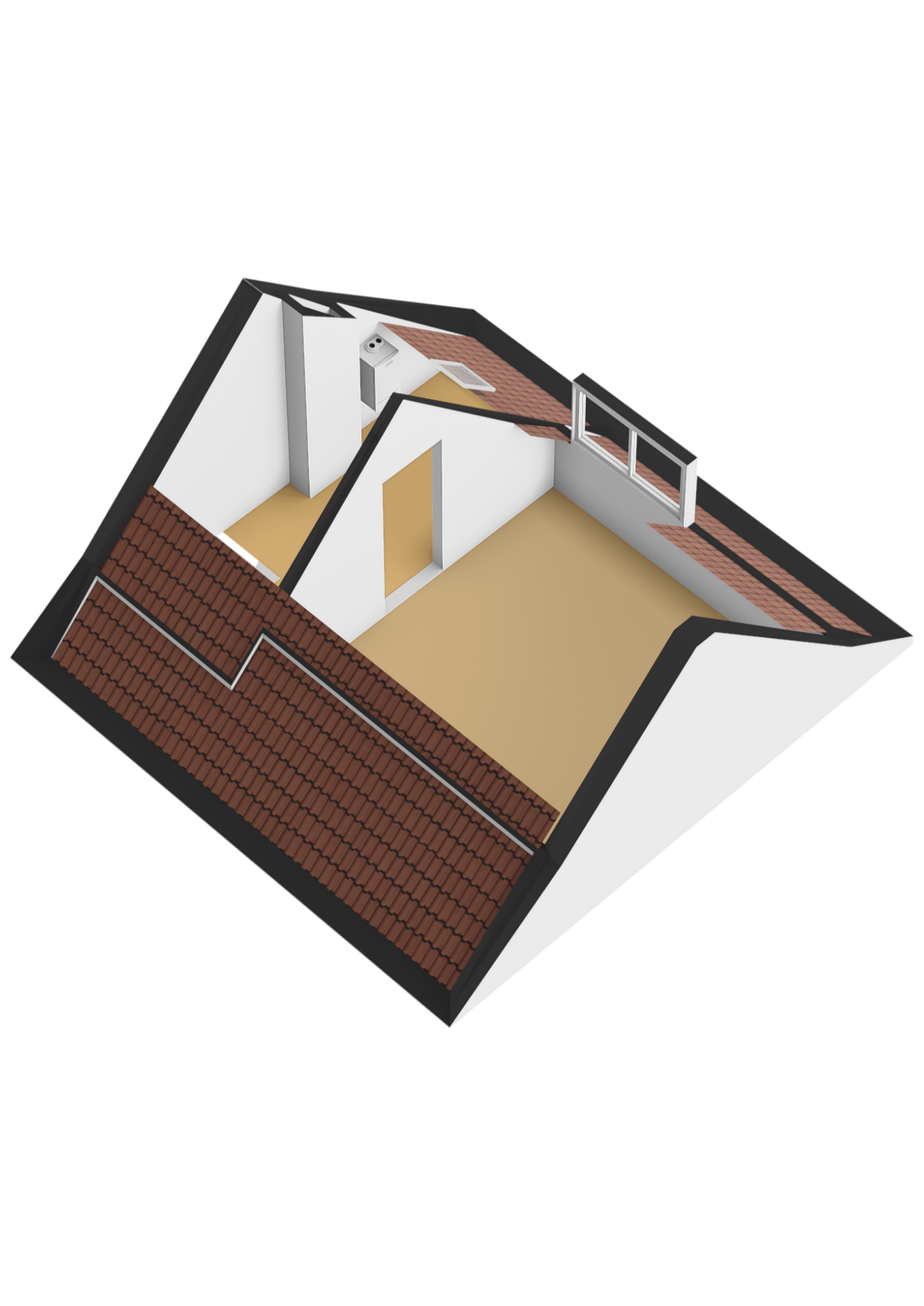 De zolderverdieping is een volwaardige, ruime kamer met een dakkapel. Hier zijn een klein dakraam (enkel glas) en de cv-ketel aanwezig.