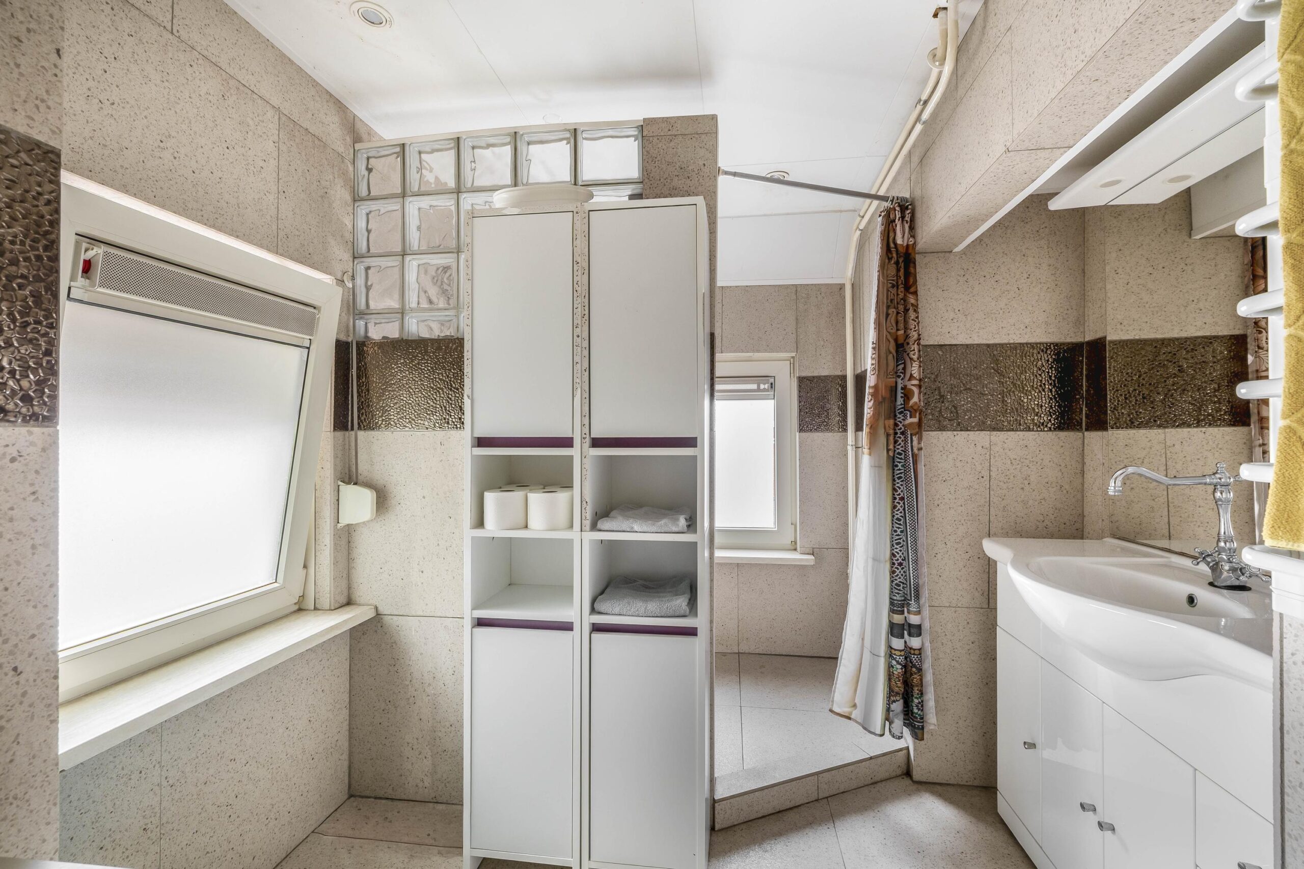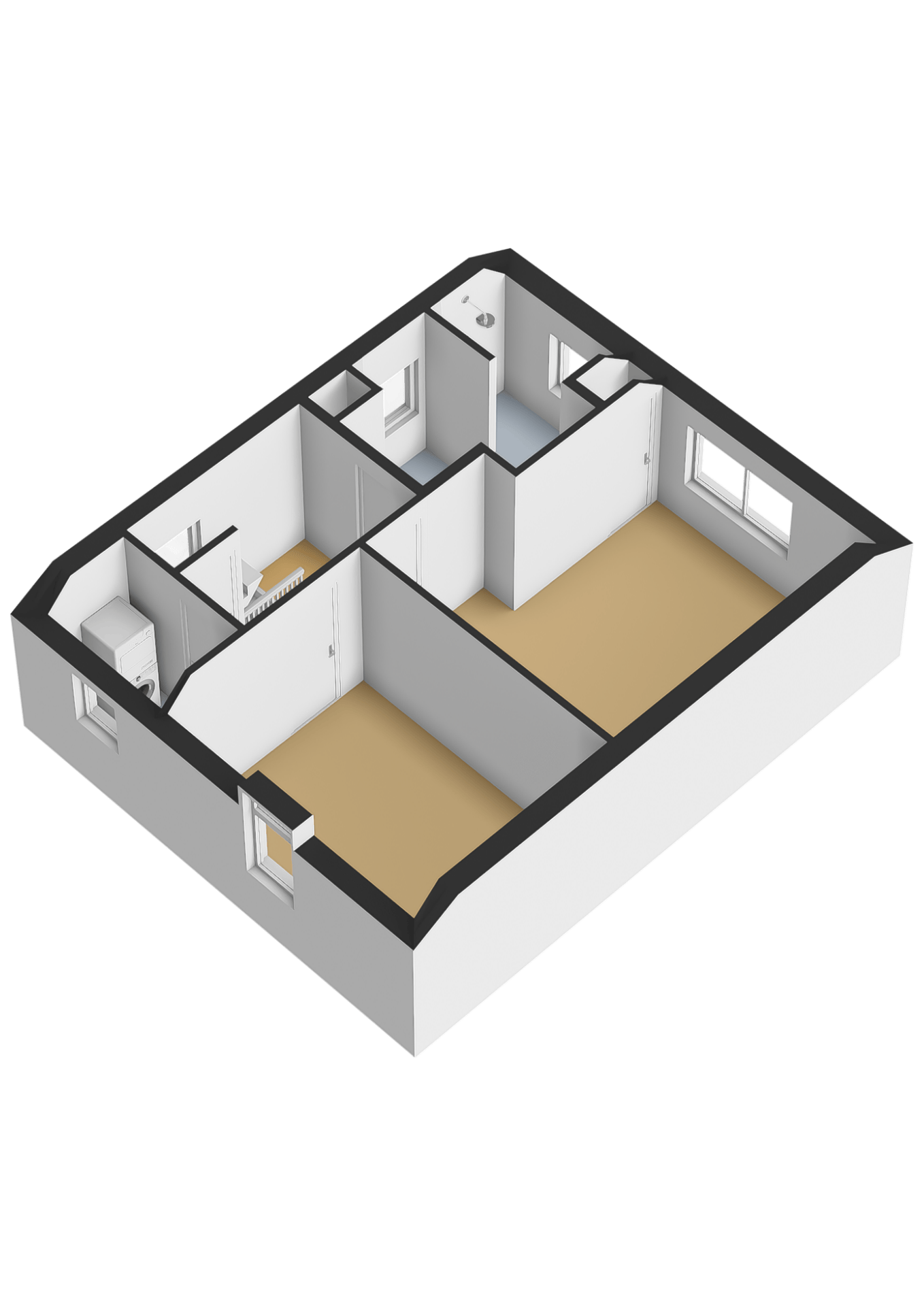 Verder zijn er een aparte wasruimte met witgoedaansluitingen en een geheel betegelde badkamer met wastafelmeubel, douche en raam aanwezig.