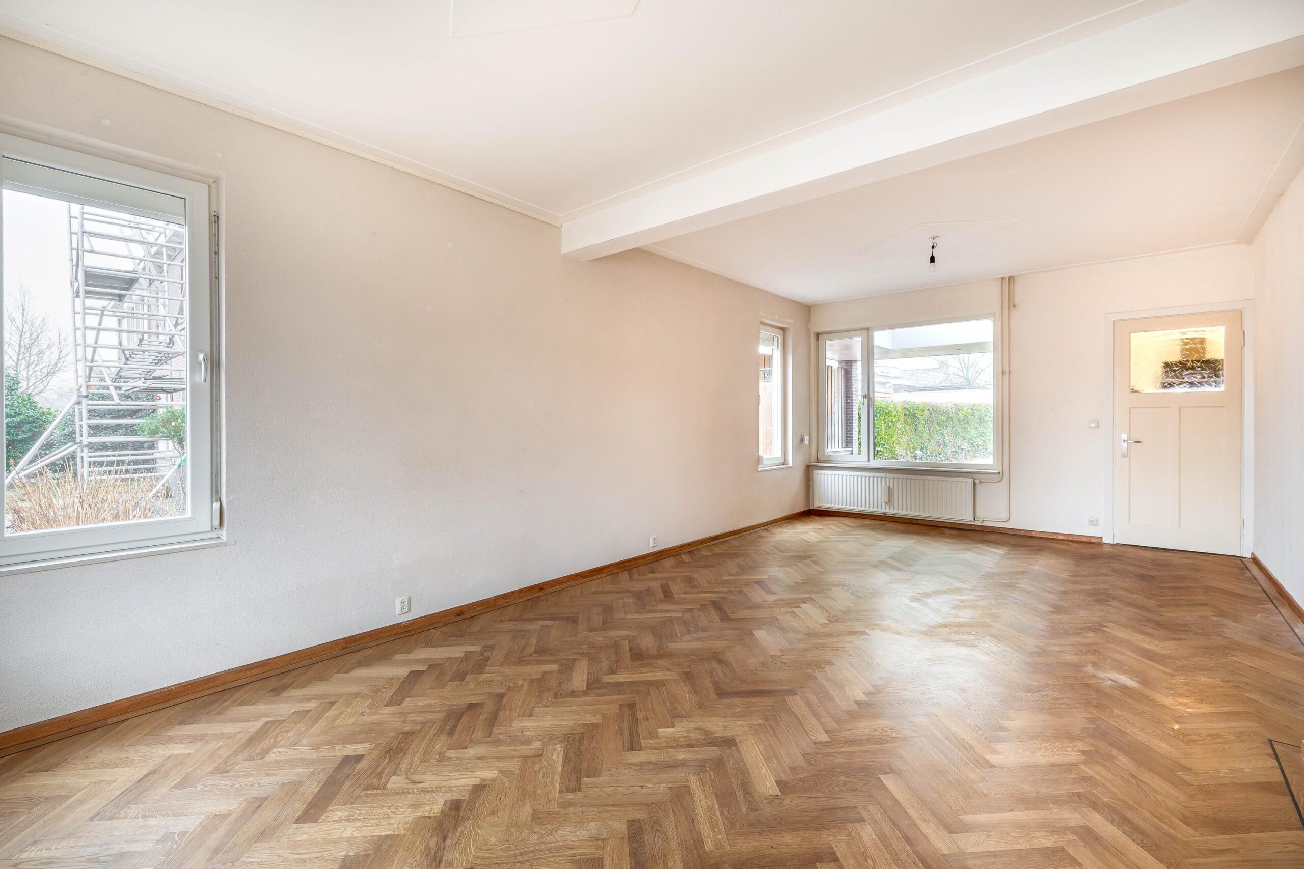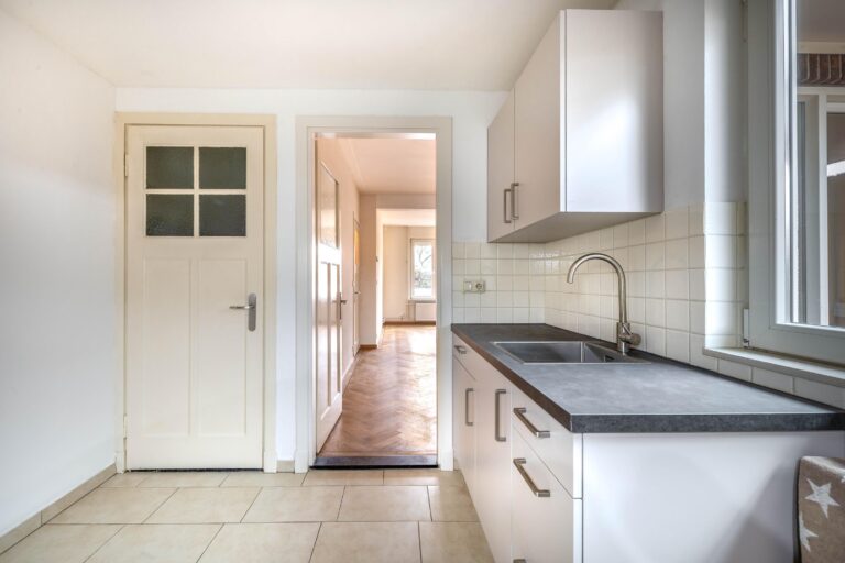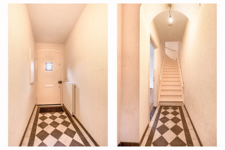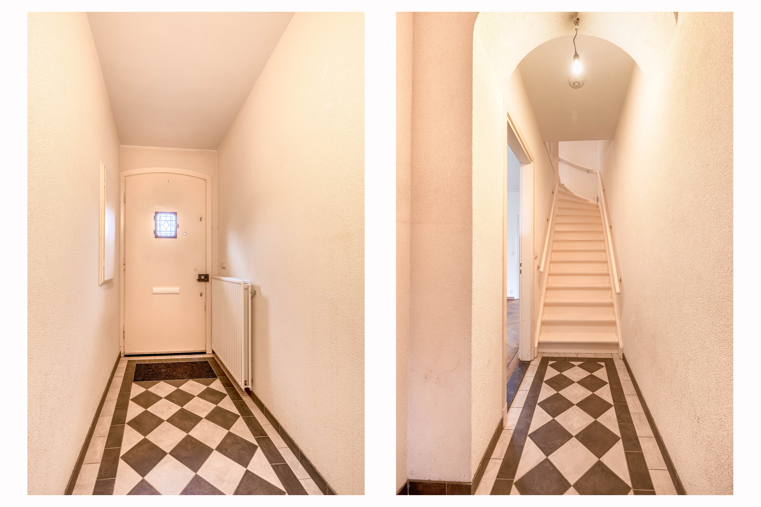 Bij binnenkomst word je direct verwelkomd door een lichte hal met authentieke tegelvloer – een knipoog naar het karakter van de woning. De royale doorzonwoonkamer is een echte blikvanger: grote raampartijen zorgen voor een prachtige lichtinval, terwijl de houten vloer en sierlijke plafondornamenten de warme jaren ’30 sfeer benadrukken. Hier voel je je meteen thuis.