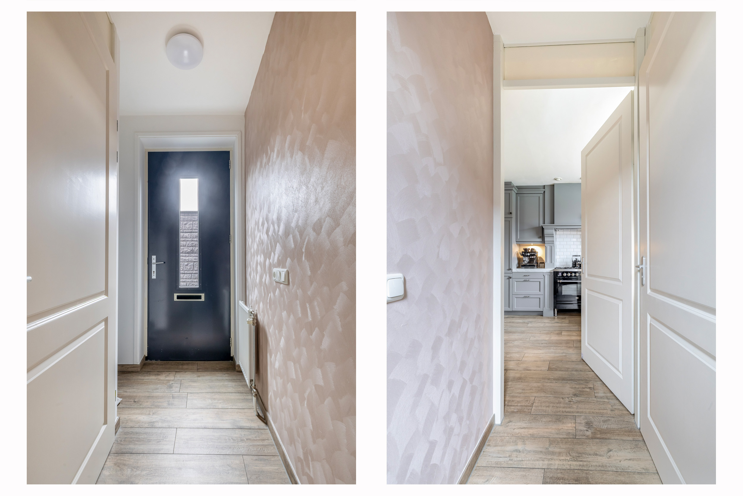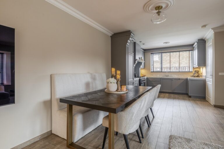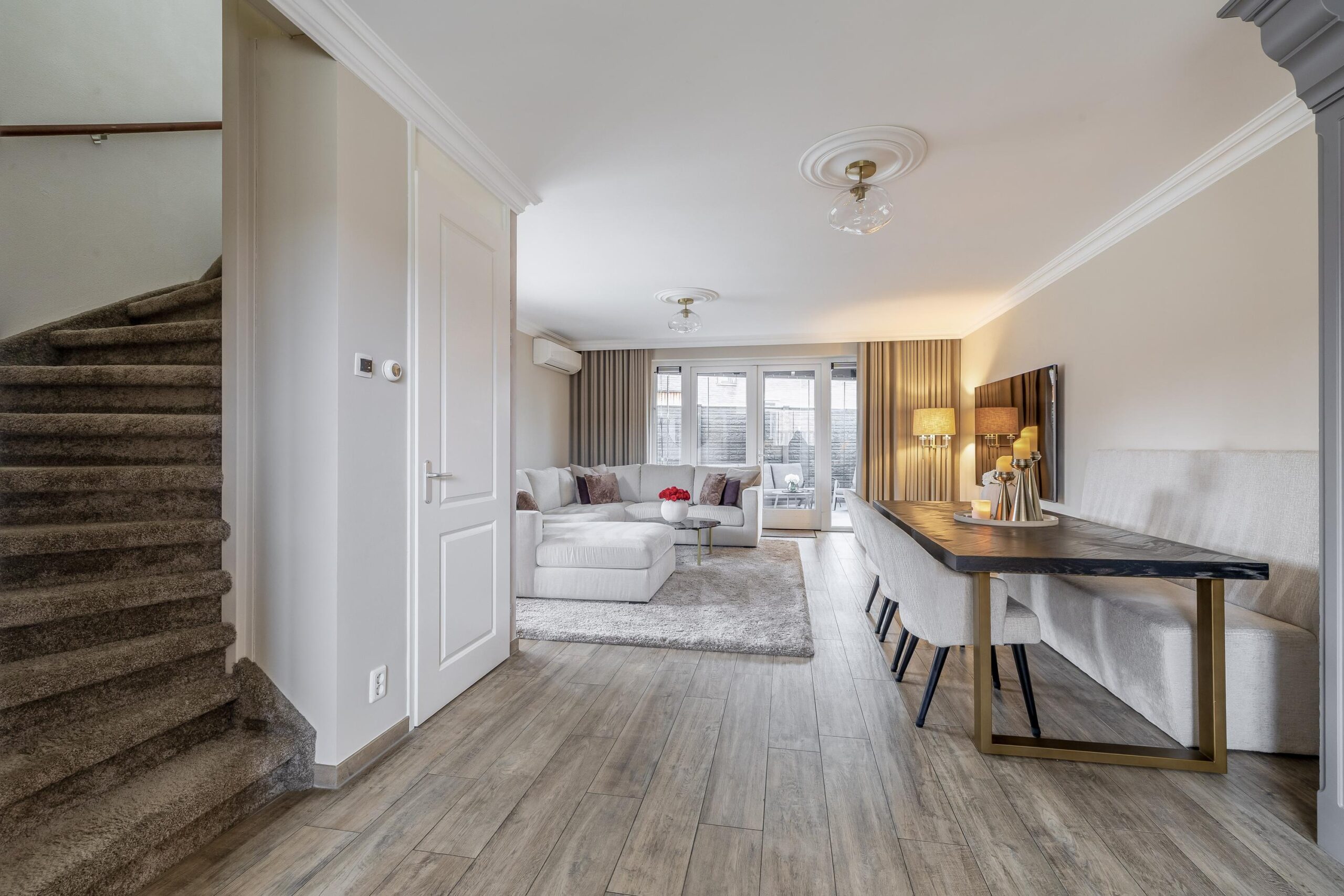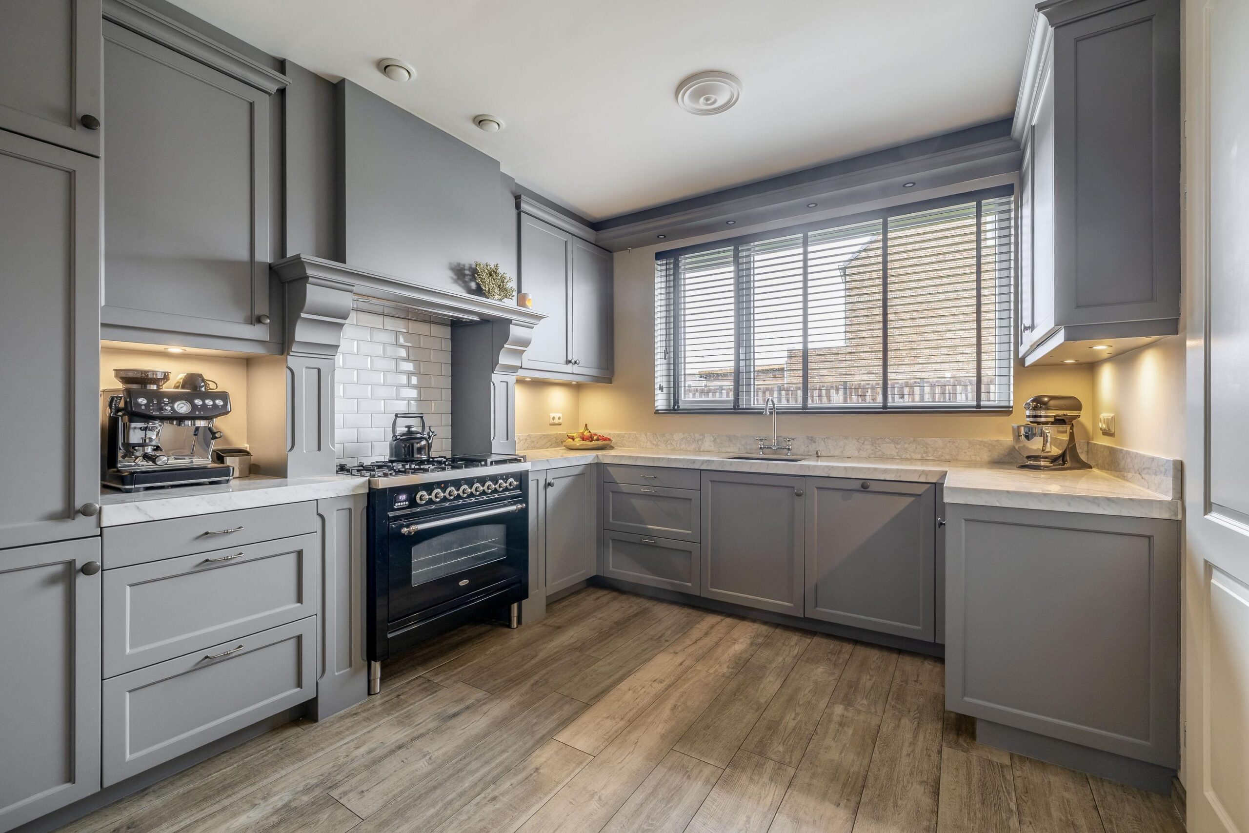 De benedenverdieping is ruim ingedeeld. De eyecatcher is de klassieke open keuken, met marmer werkblad, aan de voorzijde van de woning. De keuken is uitgerust met een groot 6-pits gasfornuis met oven, afzuigkap, vaatwasser, koelkast en diepvries. Door de erker en de openslaande deuren naar de tuin is er veel natuurlijk daglicht. De houtlook tegelvloer (met vloerverwarming) loopt door tegen de wand van het toilet en in de badkamer op de 1ste verdieping. De ruime trapkast zorgt voor extra bergruimte op de begane grond.