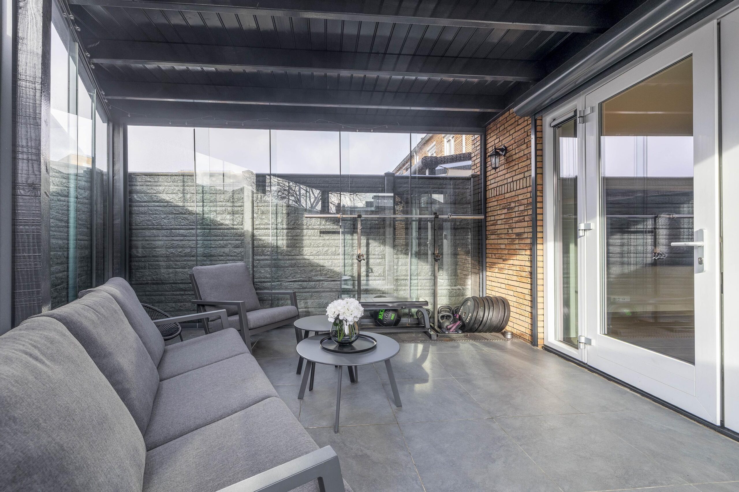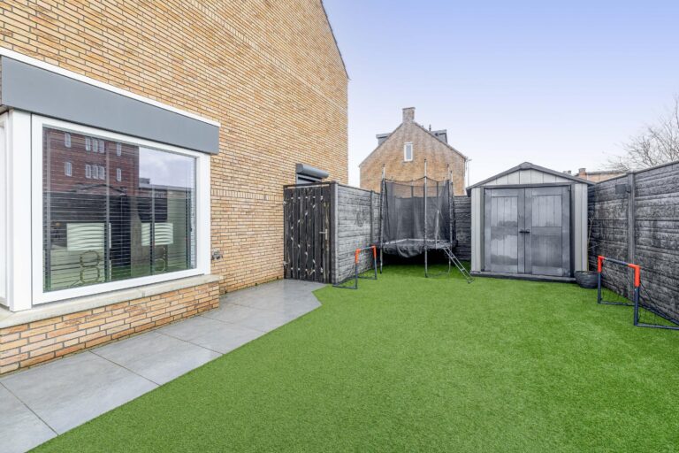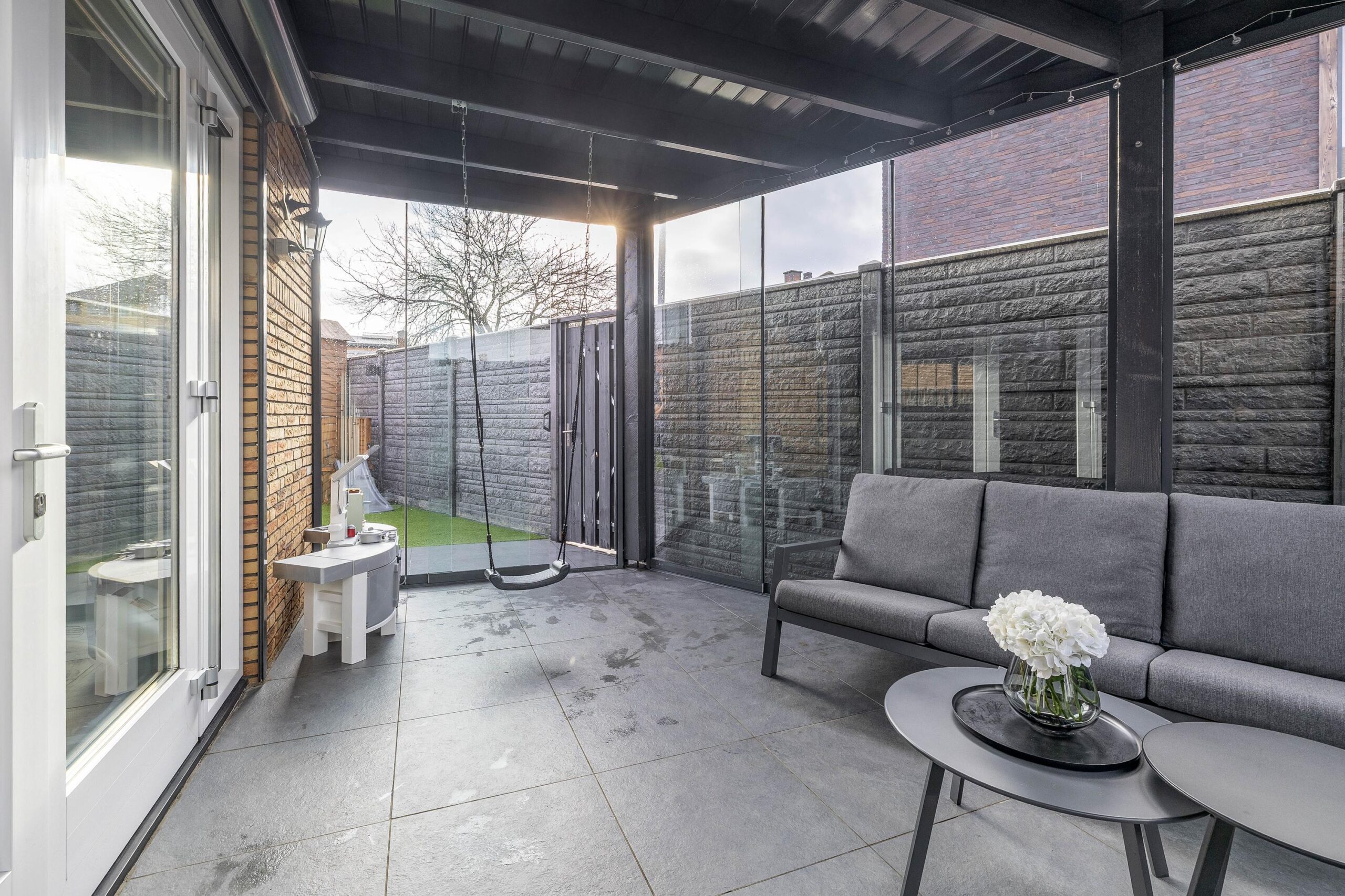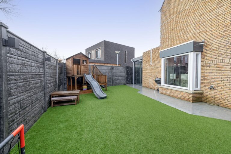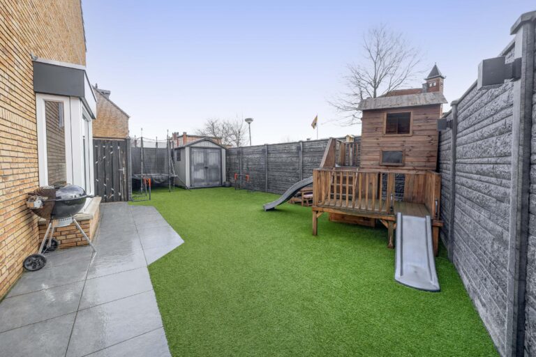 De woning ligt op een perceel van 165m². Hierdoor geniet je van een ruime zij-/achtertuin met optimale privacy. Je beschikt tevens over een vrije achterom! De tuin is aangelegd met kunstgras en heeft een houten speelhuisje en een kunststof berging. Aan de woonkamer grenst een luxe terrasoverkapping met glazen schuifwanden.