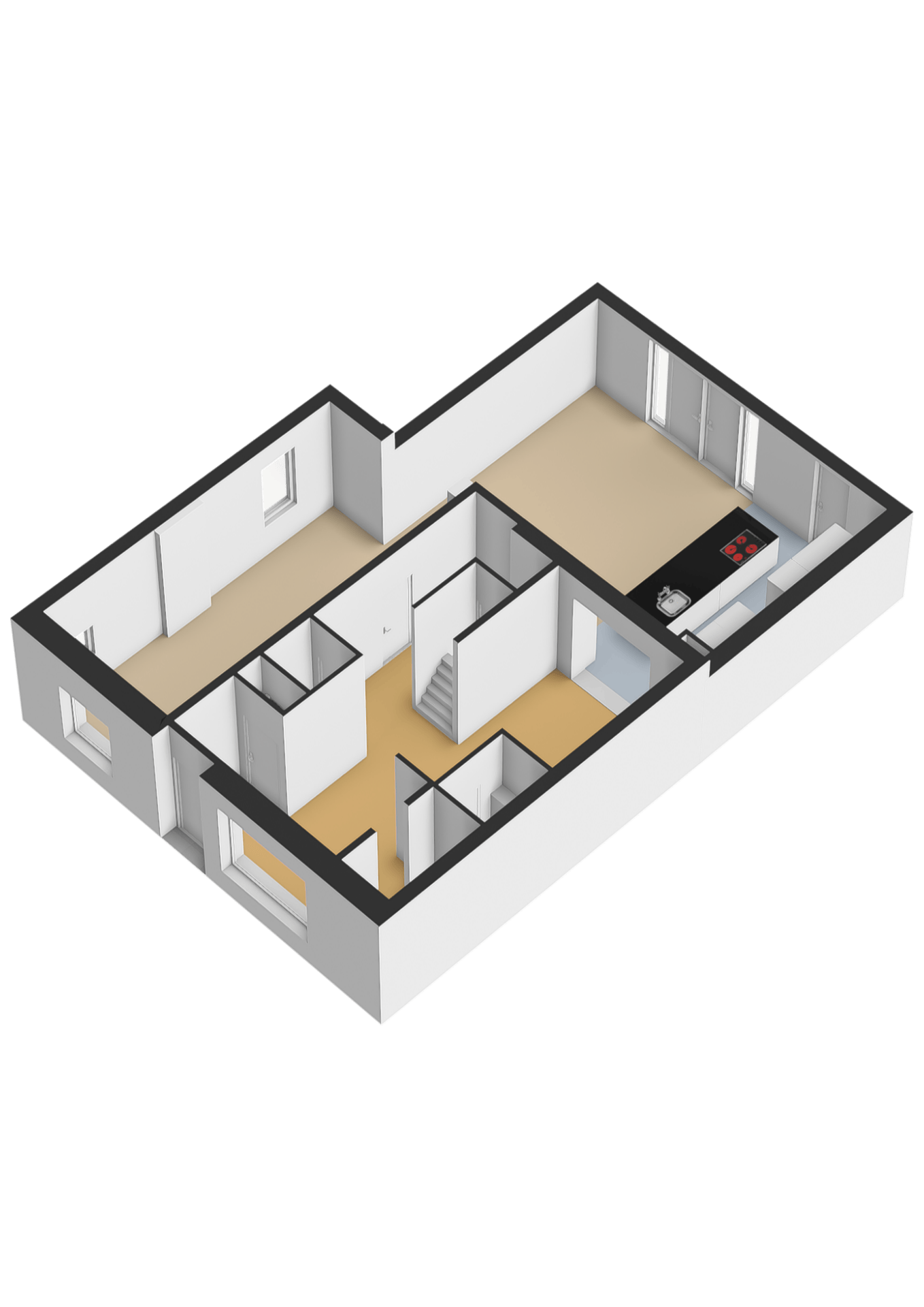 De trap in het midden van de begane grond biedt toegang tot de 1ste verdieping. Er ligt een doorlopende gietvloer over de gehele begane grond.