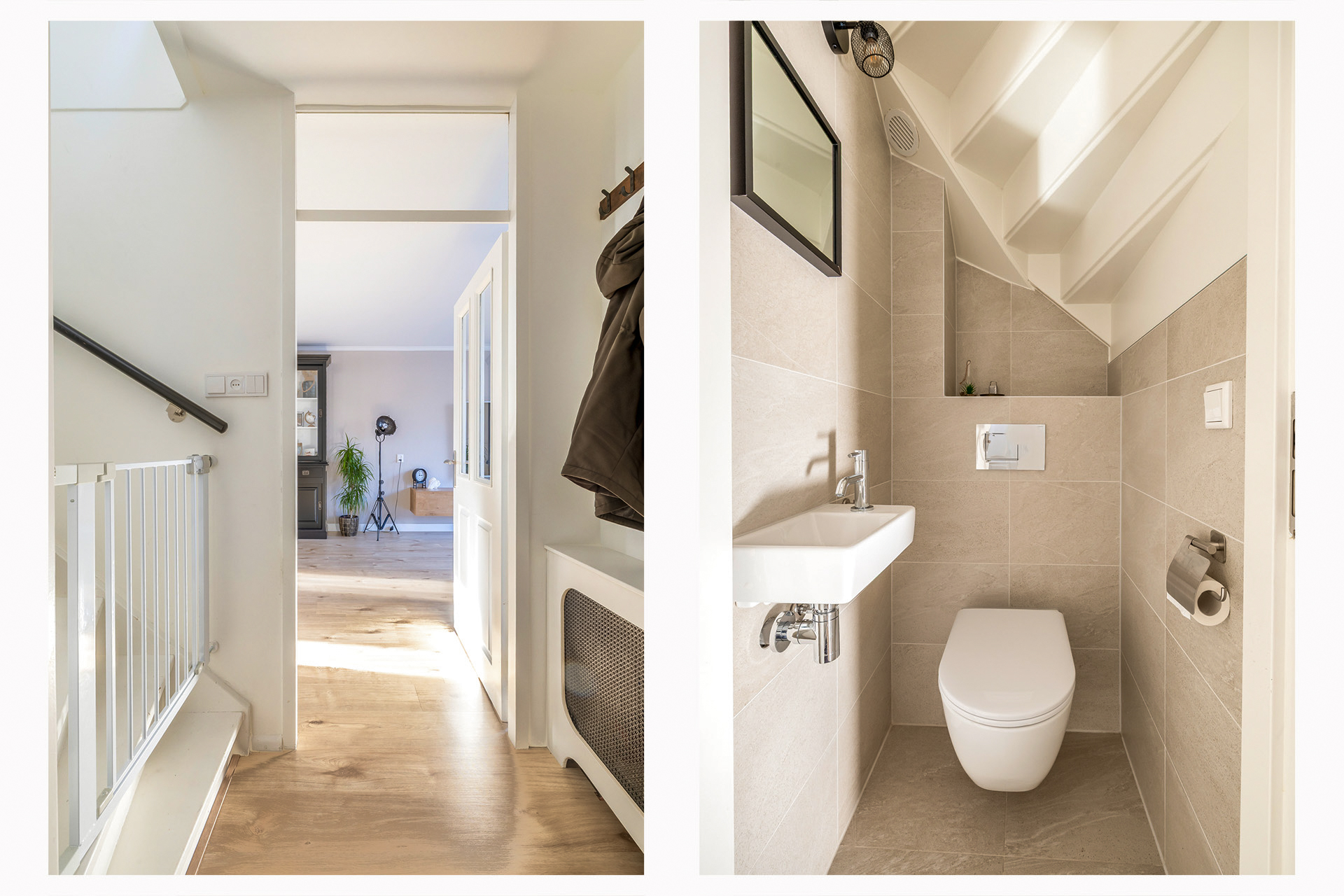 De entree geeft toegang tot de hal met een doorgelegde laminaatvloer die doorloopt naar de woonkamer en keuken. In de hal bevinden zich een modern toilet met fonteintje, de meterkast en de trapopgang naar de eerste verdieping.