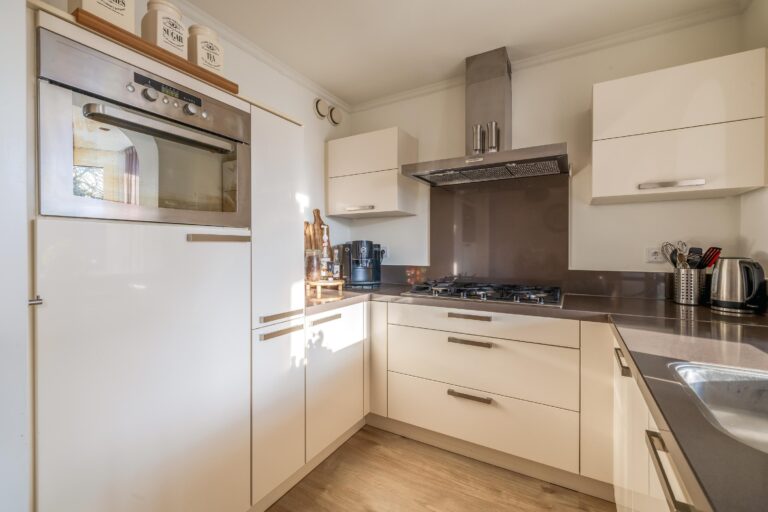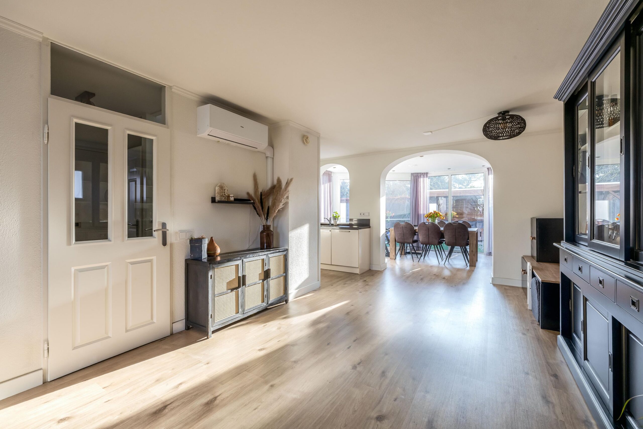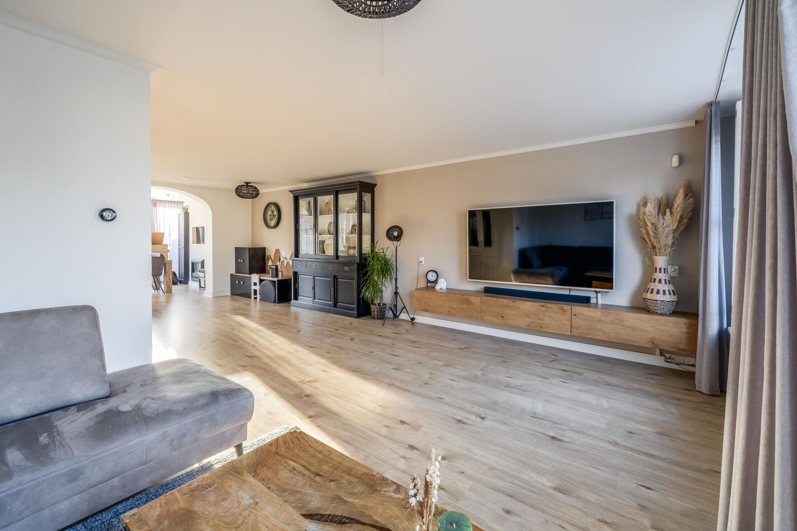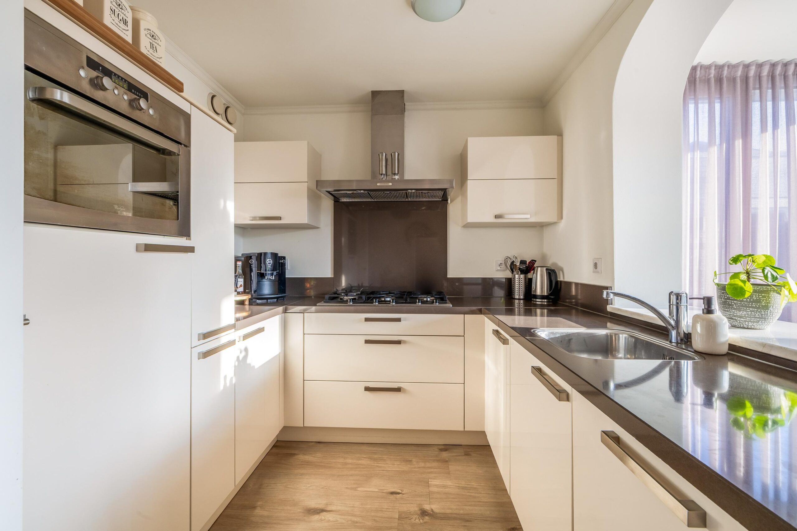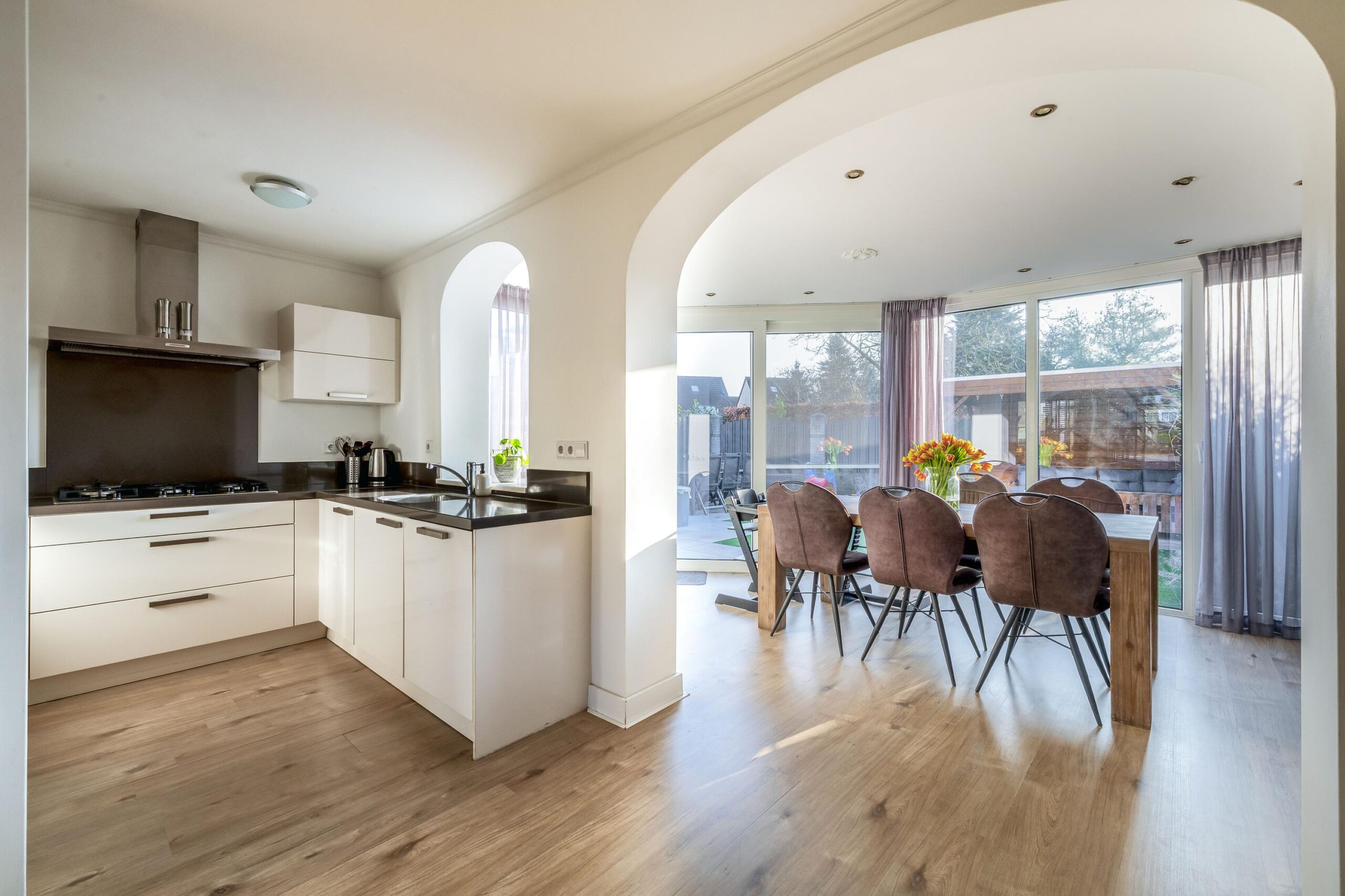 De ruime en lichte woonkamer vormt een comfortabele leefruimte. De halfopen keuken is uitgevoerd in een praktische U-opstelling en staat in directe verbinding met de aanbouw, wat zorgt voor een prettige indeling. De keuken is uitgerust met een 5-pits gasfornuis, afzuigkap, vaatwasser, combi oven-magnetron en koelkast.