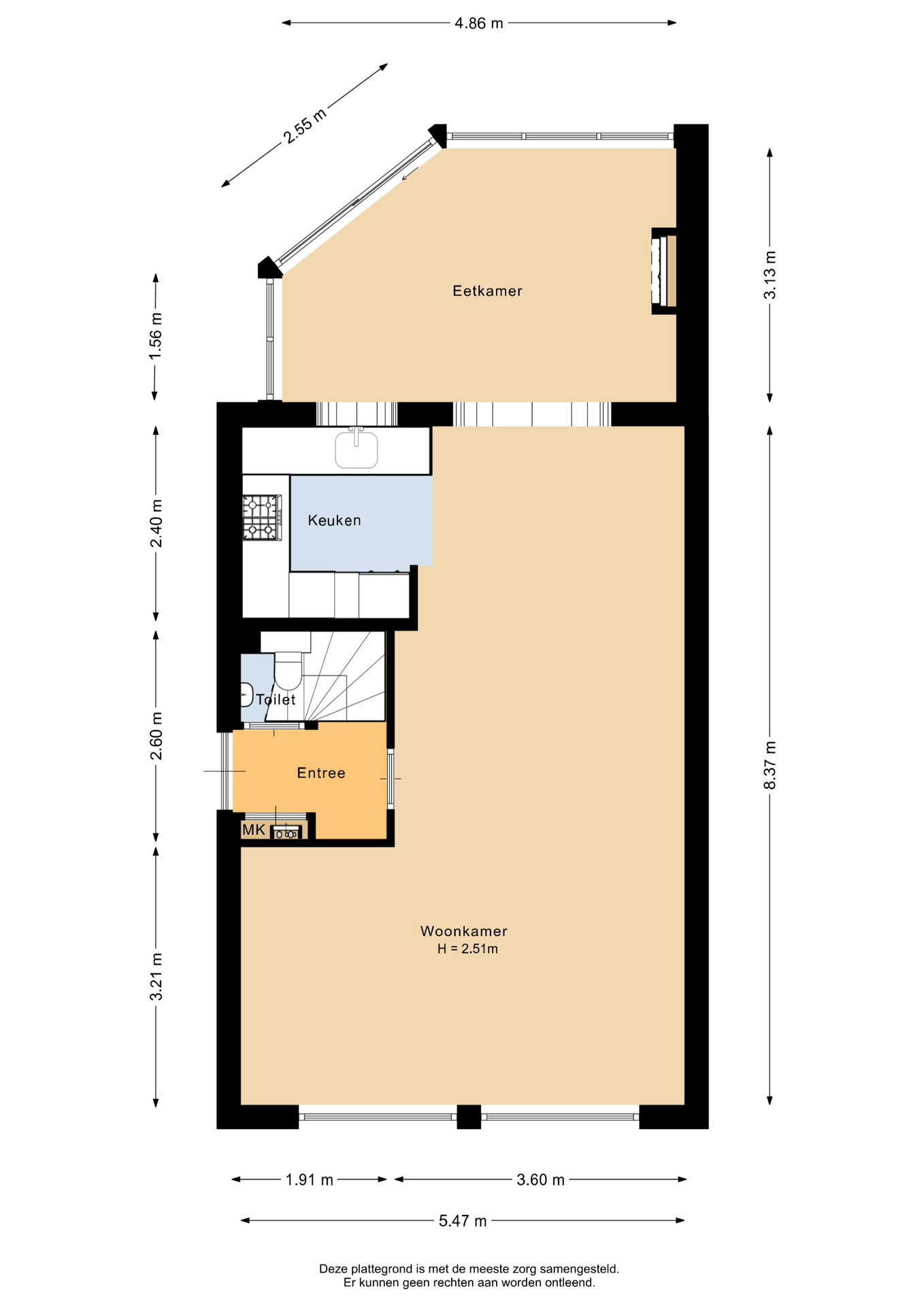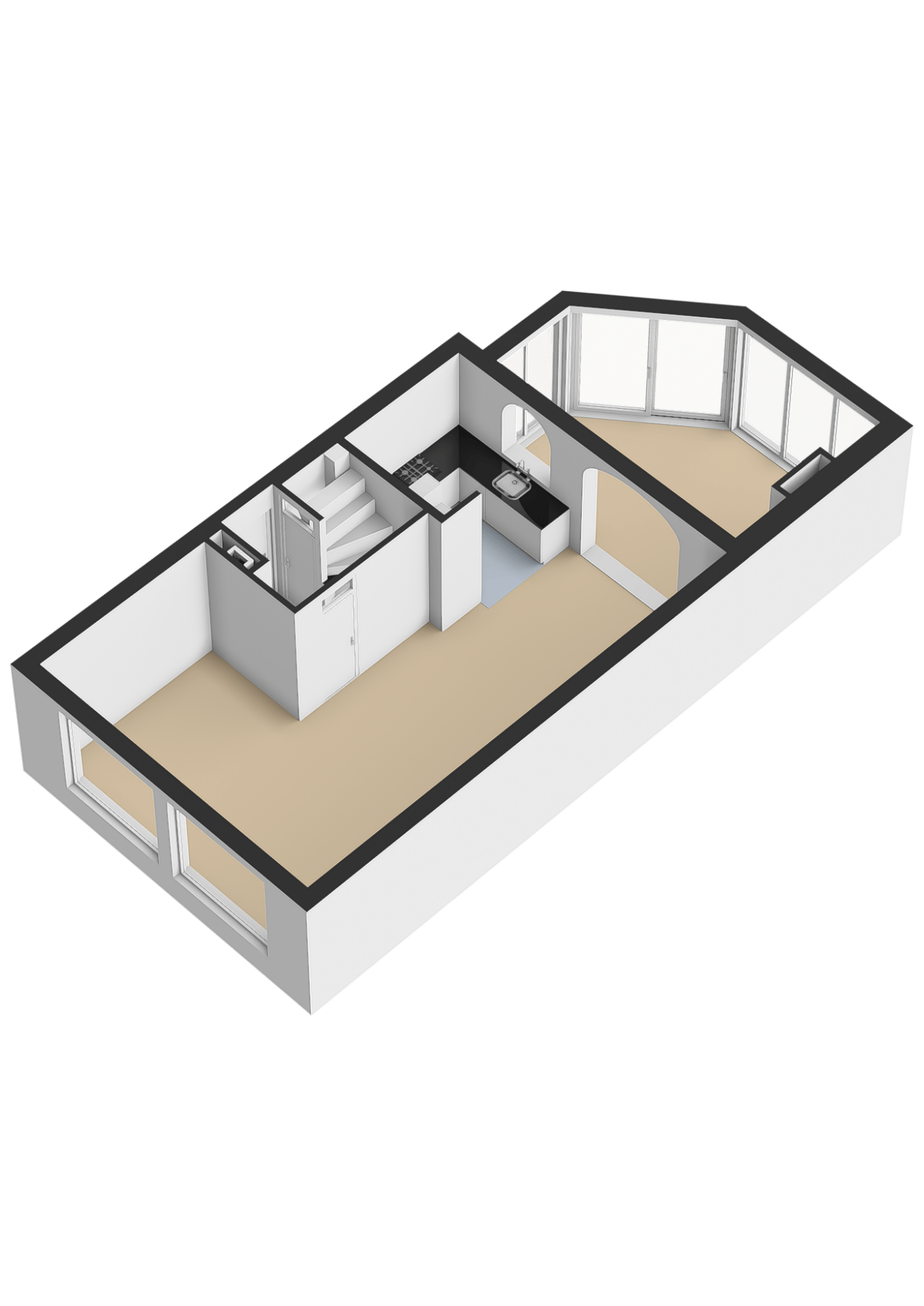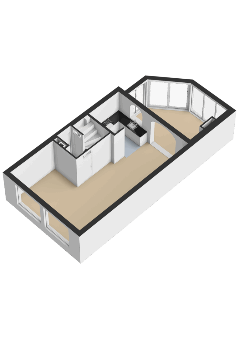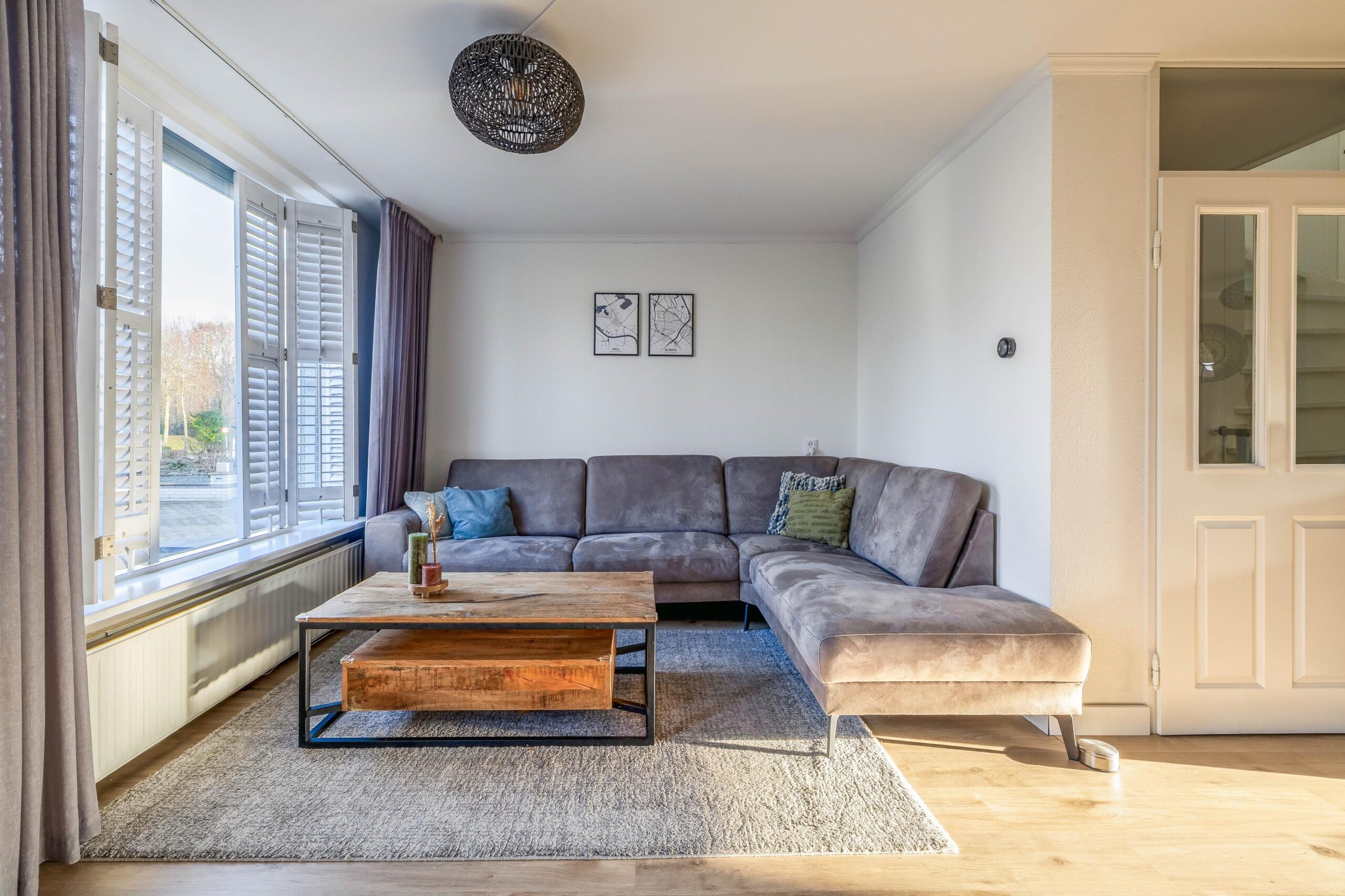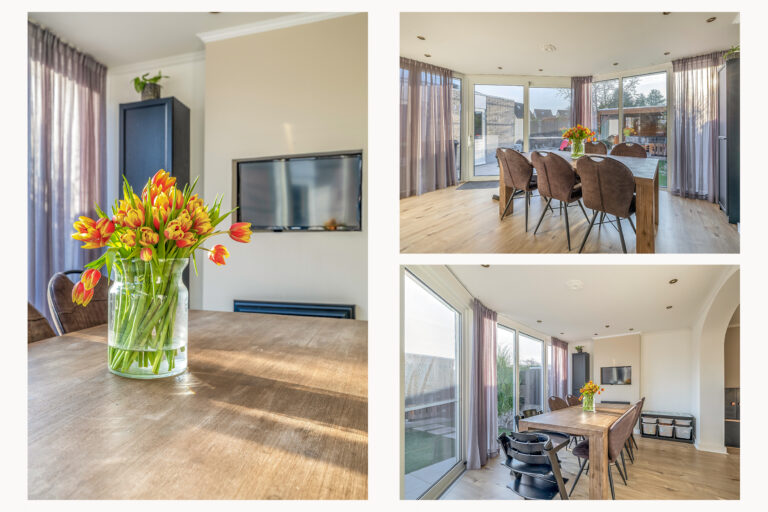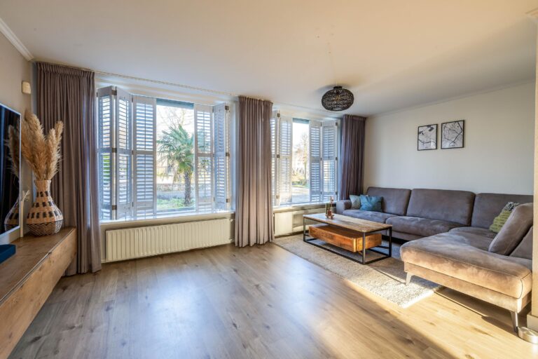 De ruime en lichte woonkamer vormt een comfortabele leefruimte. De halfopen keuken is uitgevoerd in een praktische U-opstelling en staat in directe verbinding met de aanbouw, wat zorgt voor een prettige indeling. De keuken is uitgerust met een 5-pits gasfornuis, afzuigkap, vaatwasser, combi oven-magnetron en koelkast.