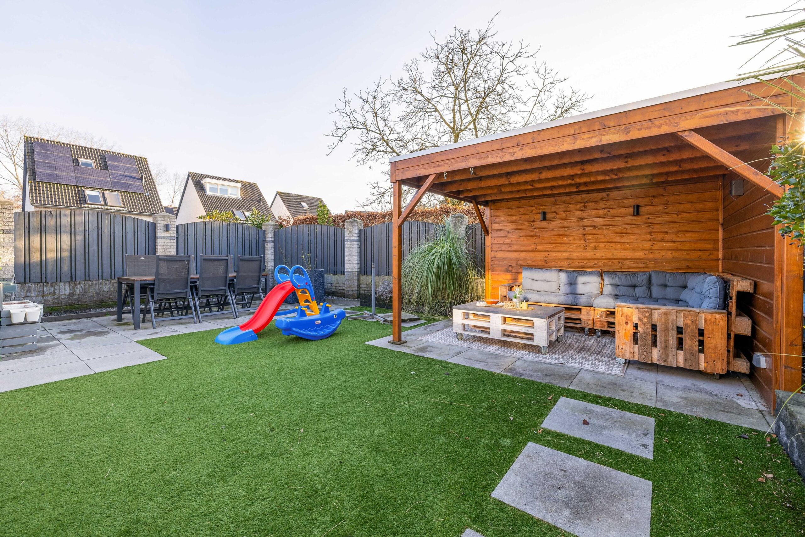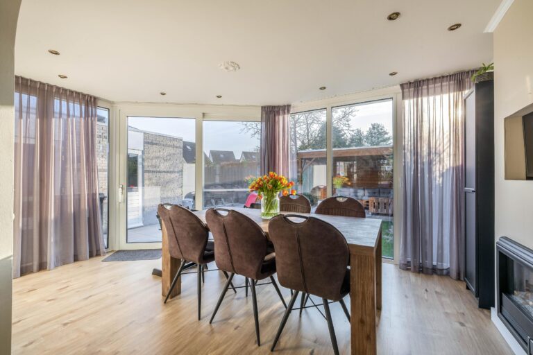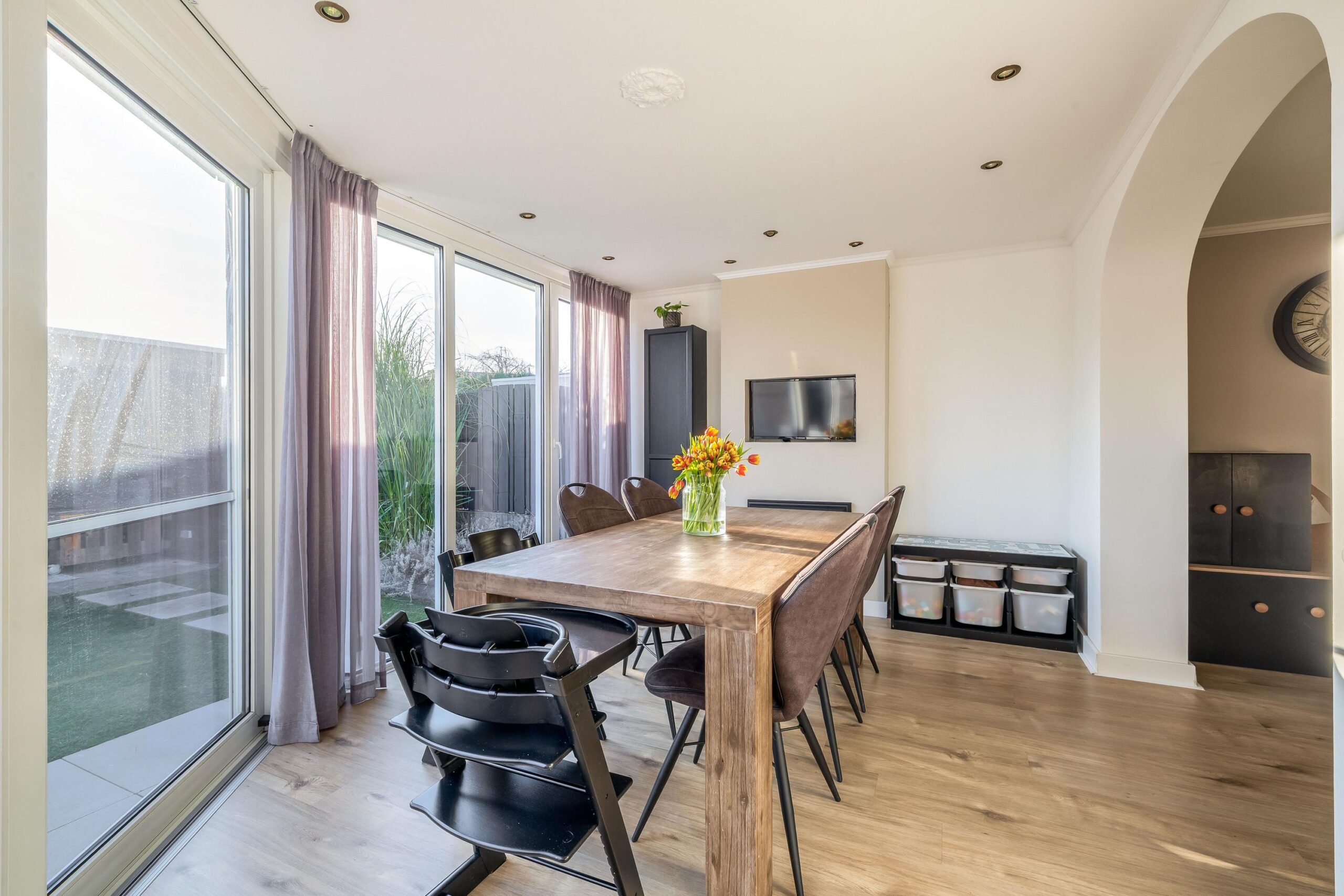 In de aanbouw is ruimte voor een royale eethoek met sfeervolle elektrische haard. Via de schuifpui met hor is de achtertuin bereikbaar. De op het zuiden gelegen tuin biedt volop zon en beschikt daarnaast over een overkapping met internet aansluiting, ideaal voor ontspannen momenten in de schaduw.