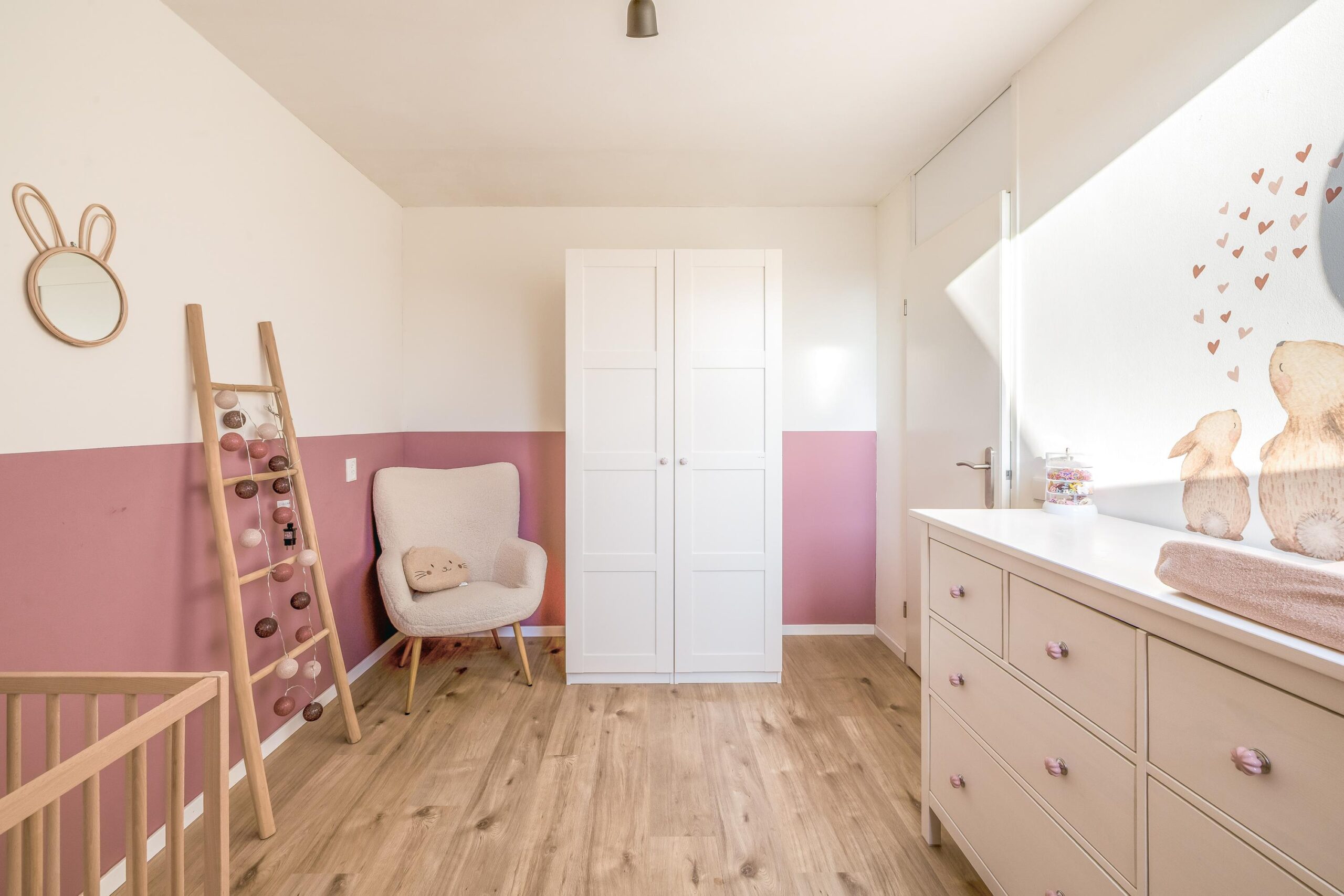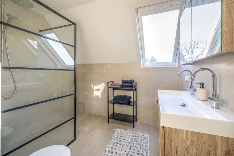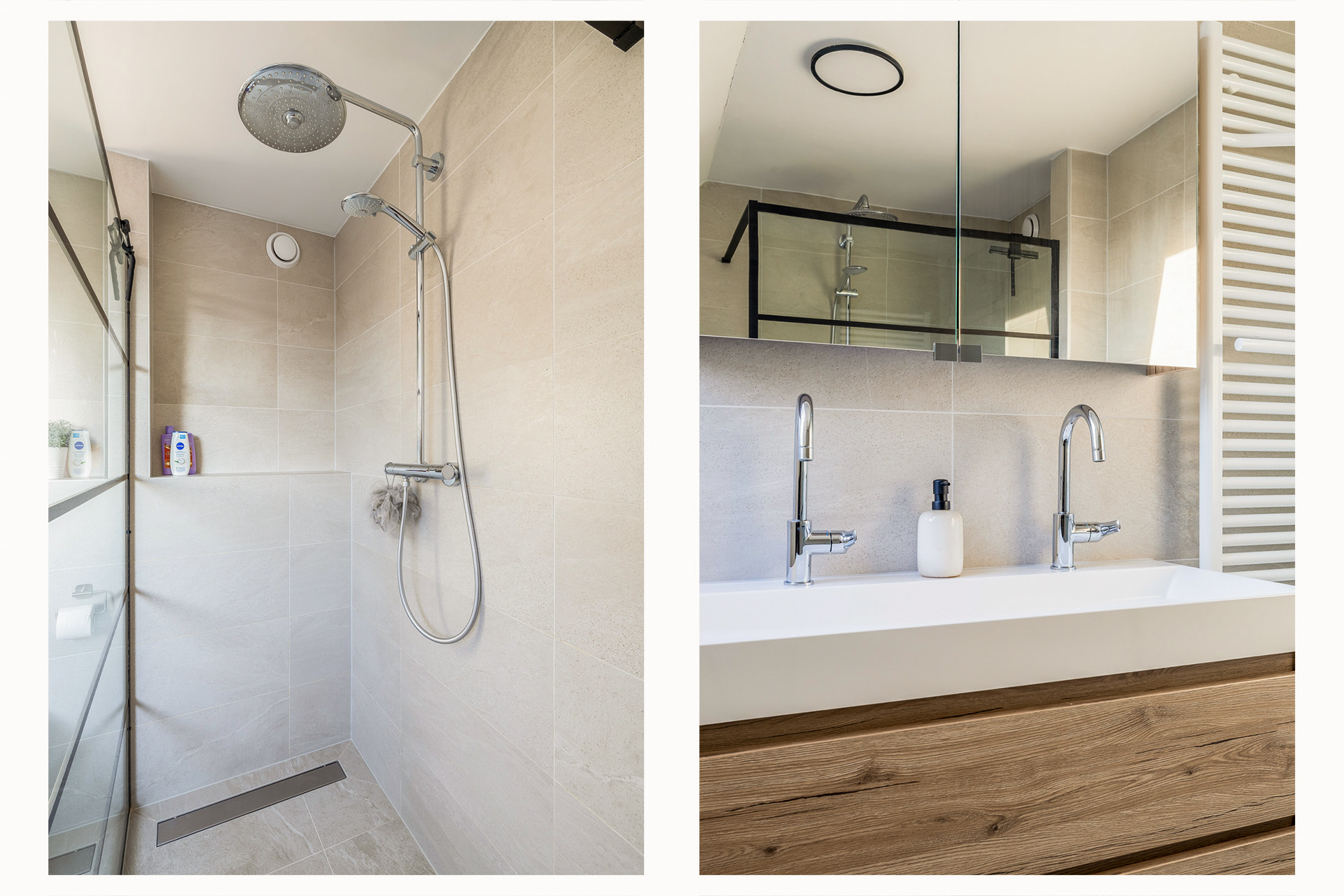 Op de eerste verdieping bevinden zich drie ruime slaapkamers. Alle slaapkamers zijn voorzien van elektrische rolluiken en een laminaatvloer. De slaapkamers aan de voorzijde hebben een dakkapel. De moderne badkamer is ingericht met een inloopdouche, dubbele wastafel met meubel, toilet en mechanische ventilatie. Op de overloop is een airco geplaatst voor extra comfort, zowel in de zomer als winter.