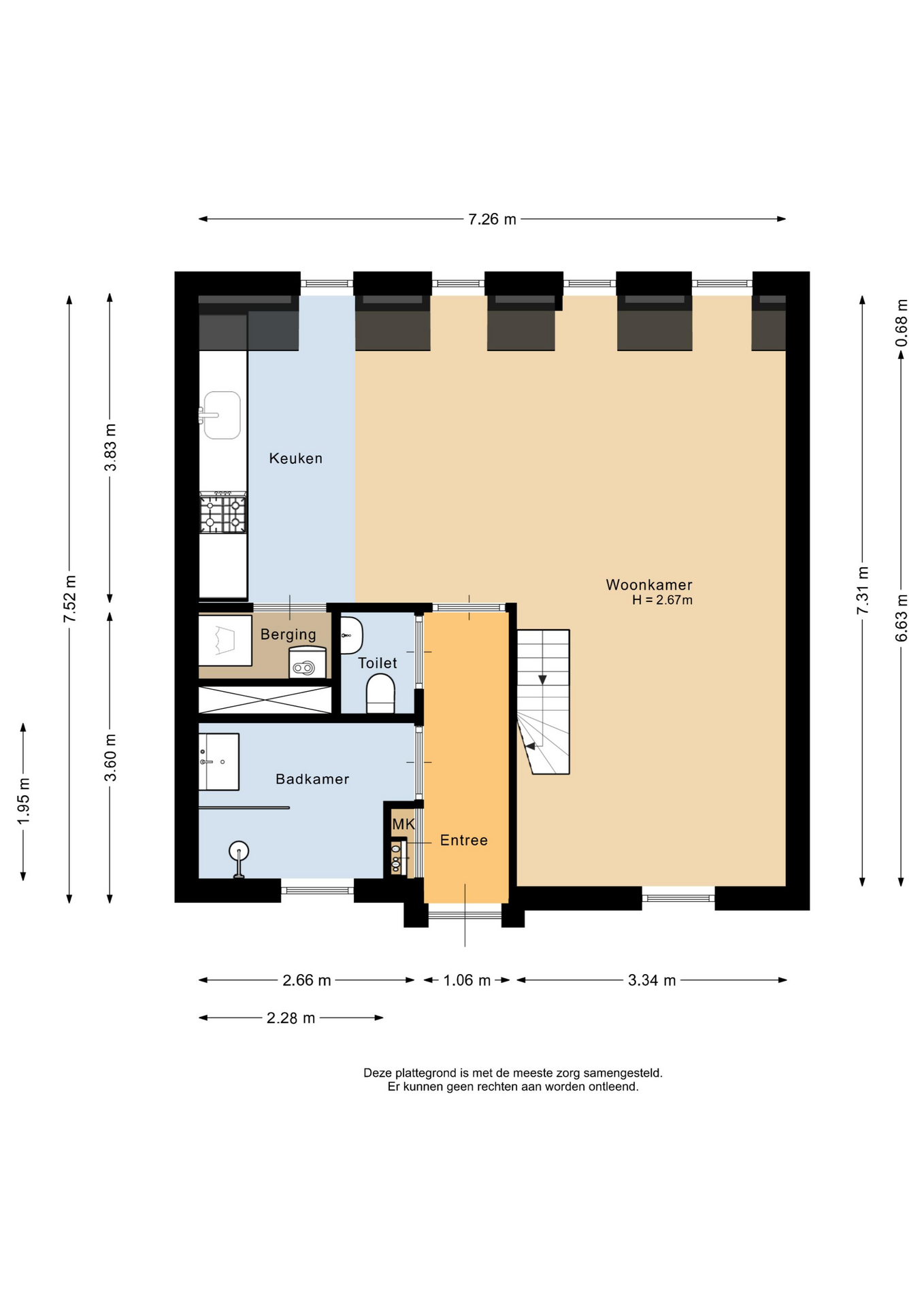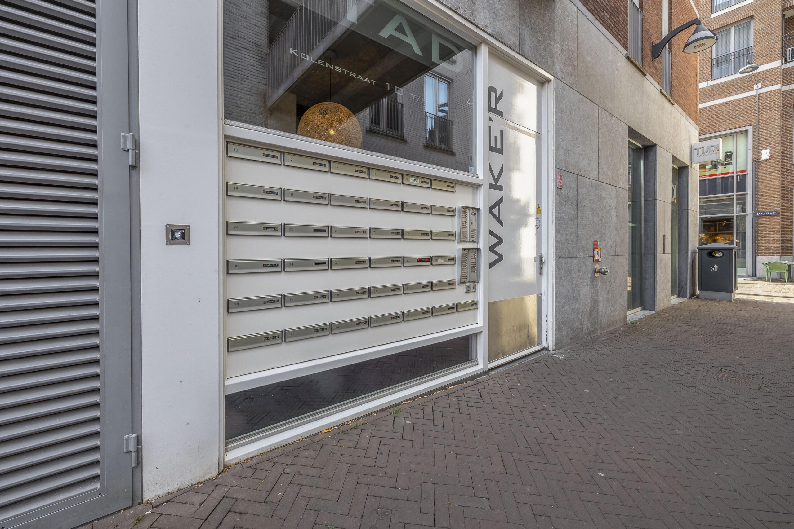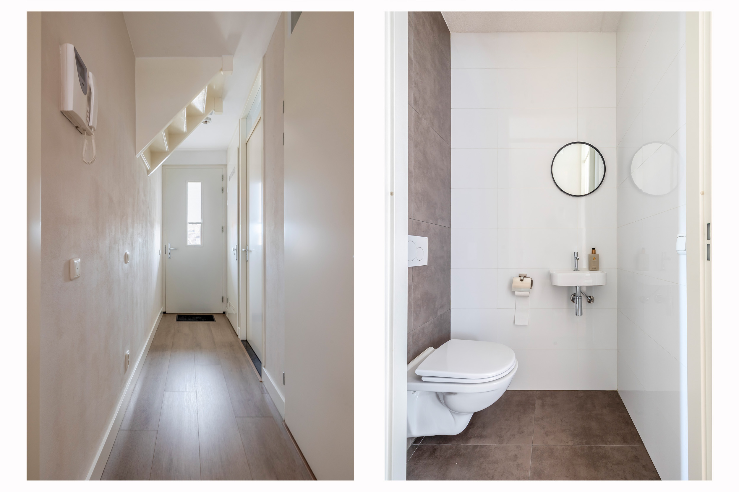 Vanuit de galerij is het appartement bereikbaar. De hal biedt toegang tot de meterkast, het toilet met fonteintje, de badkamer en de woonkamer met open keuken .