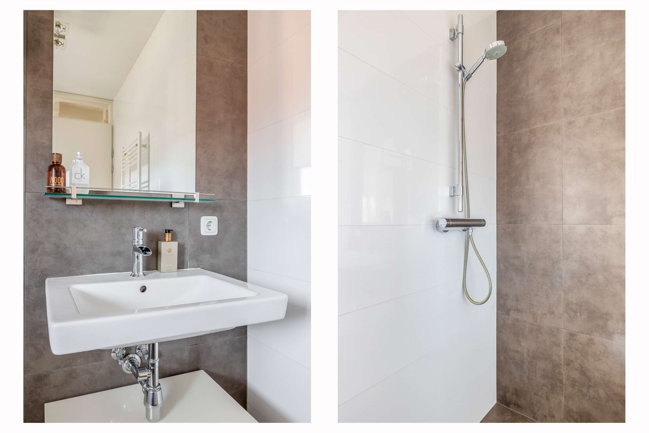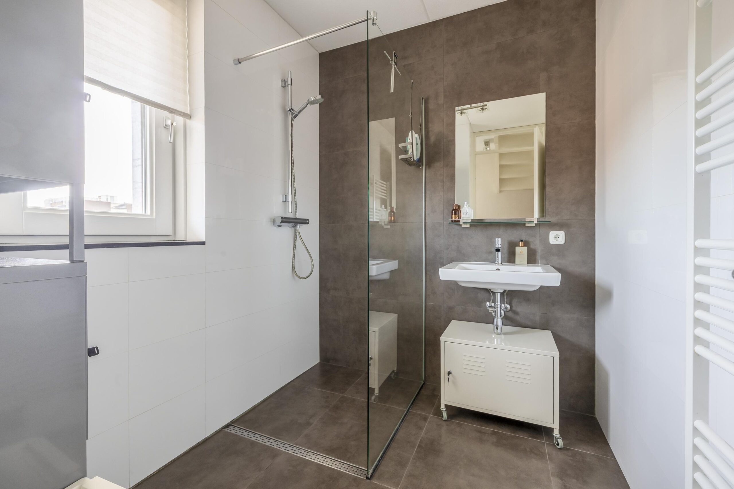 In de badkamer zijn een inloopdouche, wastafel en designradiator aanwezig. Het raam zorgt voor volgende daglicht en tevens natuurlijke ventilatie.