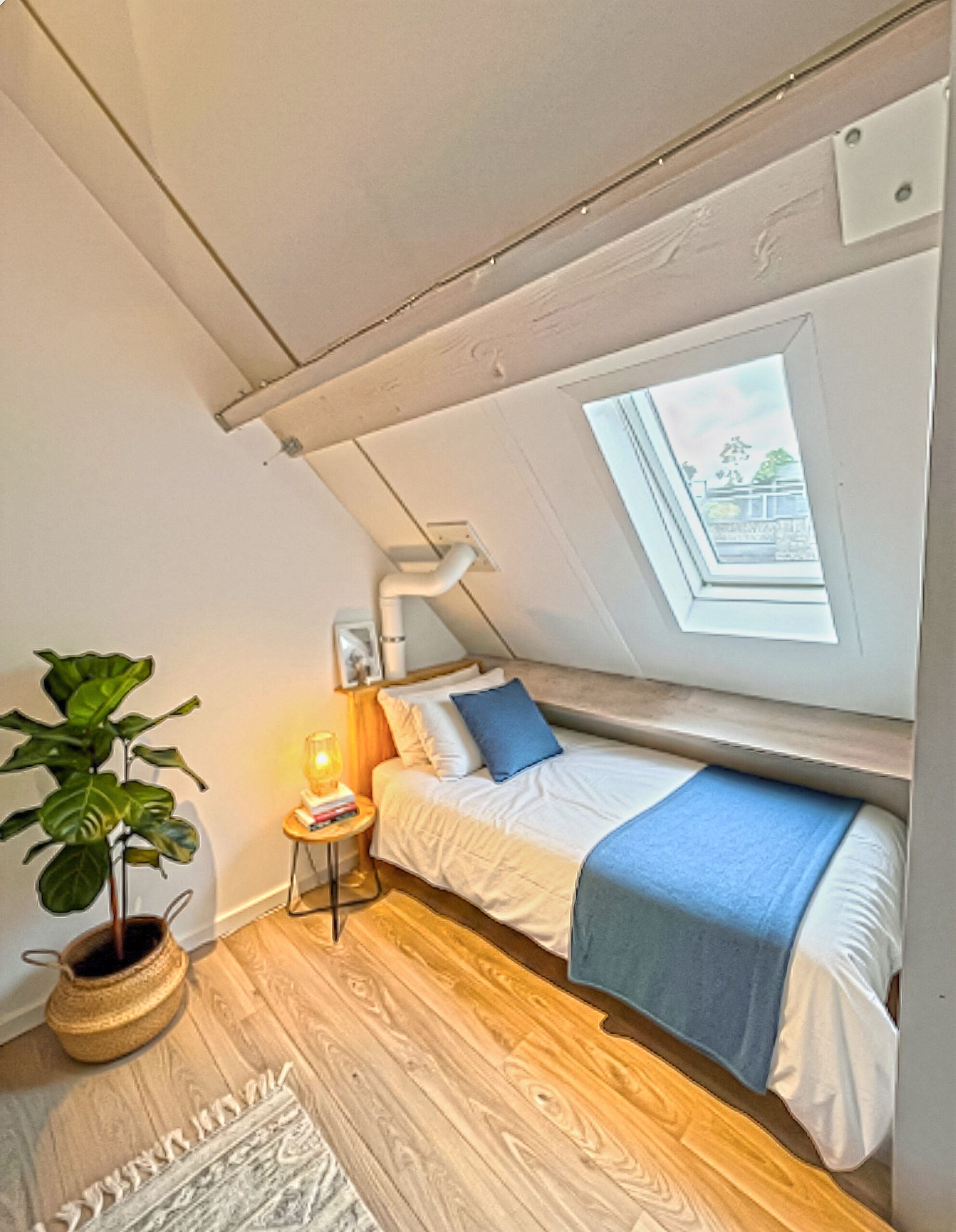 Hier zijn een grote slaapkamer met Velux dakraam en veel bergruimte en een tweede, kleinere slaapkamer/mogelijk kantoor met Velux dakraam aanwezig. Ten slotte is hier nog een berging aanwezig.