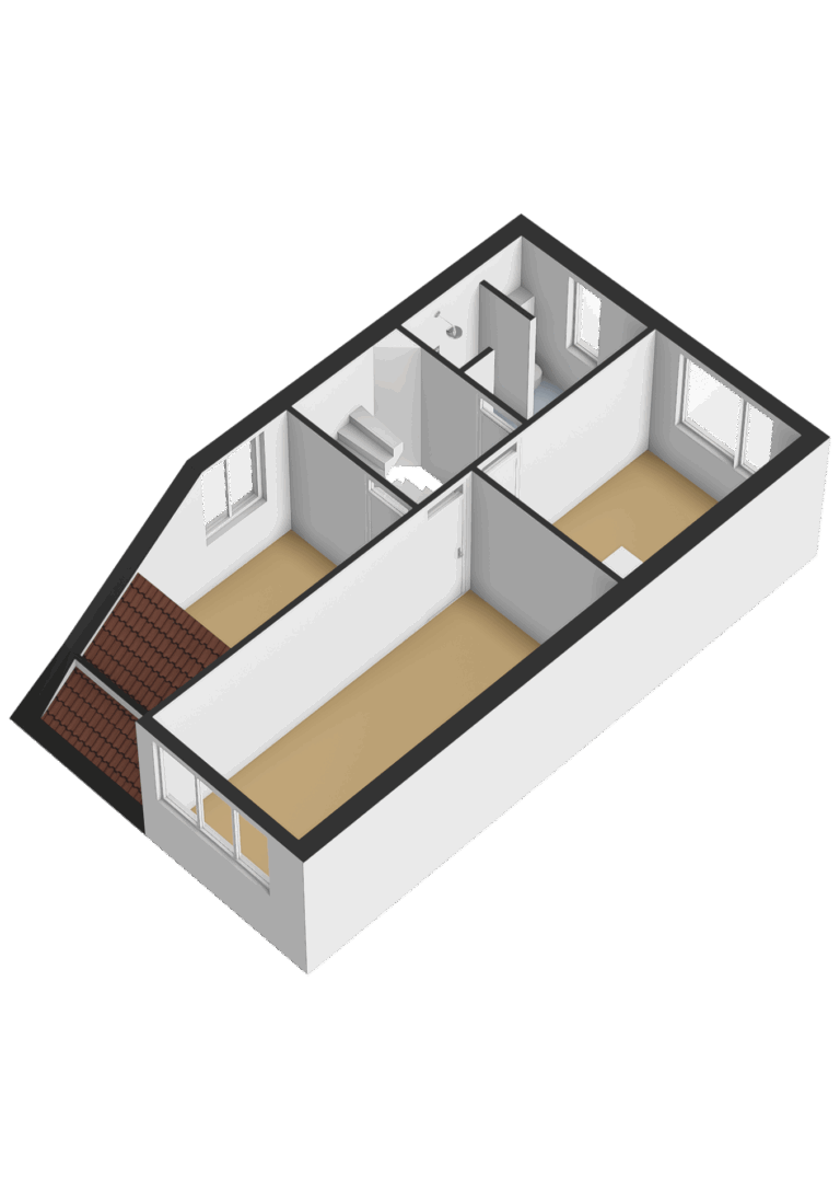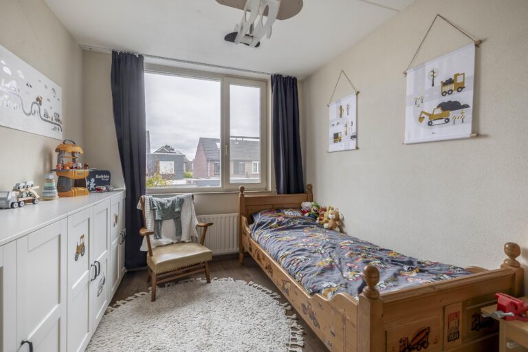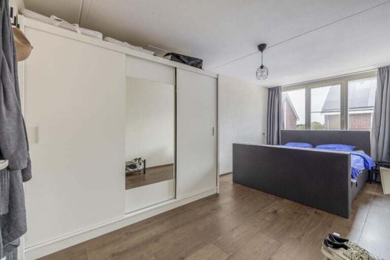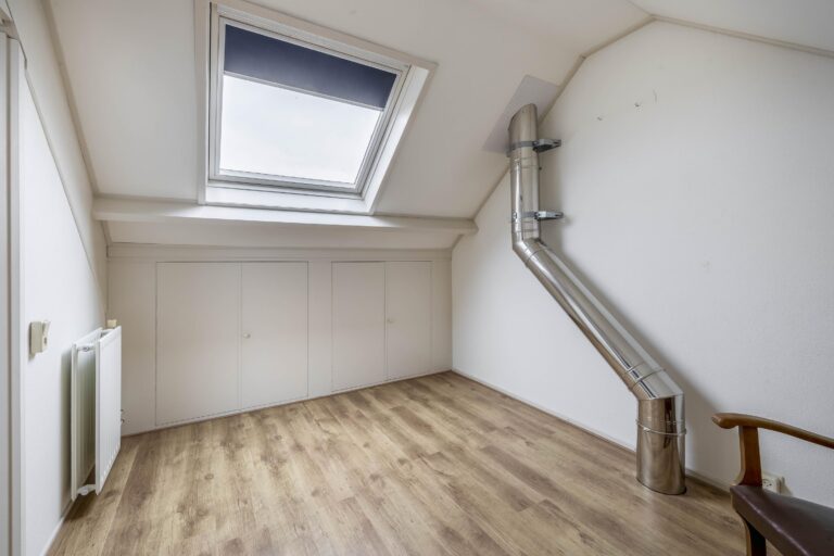 De vierde slaapkamer is ruim en biedt veel opbergruimte. Twee dakramen met screens zorgen voor veel daglicht op dze verdieping.