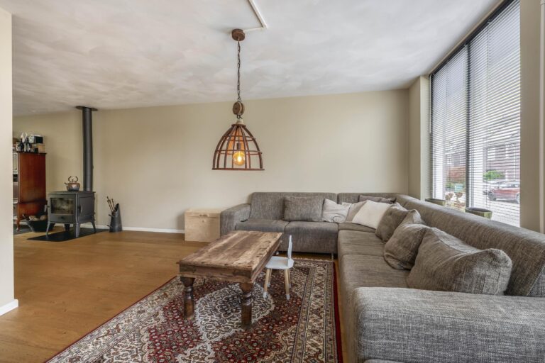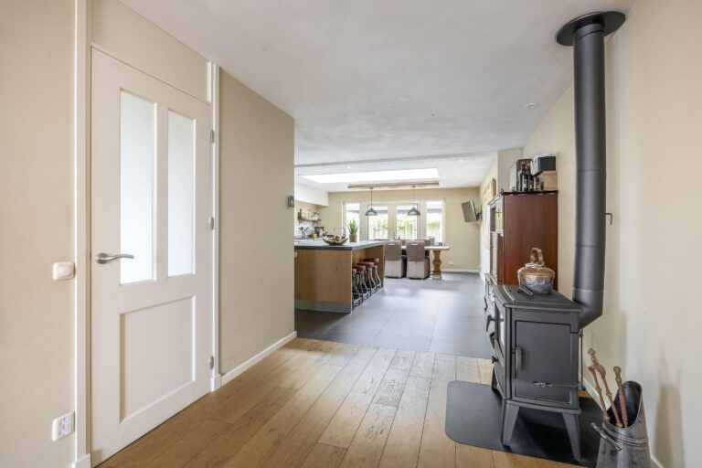 De ruime woonkamer is voorzien van een massief eiken vloer. De houtkachel zorgt voor veel sfeer. In 2015 is de royale aanbouw gerealiseerd die in open verbinding staat met de woonkamer. In deze aanbouw ligt een moderne tegelvloer met vloerverwarming. De grote glazen pui met terrasdeuren alsmede de lichtstraat zorgen voor een fijne lichtinval. In deze ruimte is veel aandacht geschonken aan de keuken.