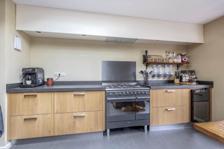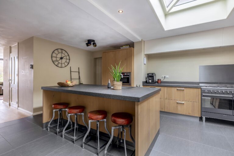 Aan het keukeneiland met veel kastruimte, de vaatwasmachine en spoelbak met quooker, is een gezellig zitje gemaakt. De werkbladen zijn van natuursteen. Verder beschikt de keuken over een koel/vriescombinatie, afzuigkap, oven/steamer, een wijnkoeler en een kooktoestel met twee ovens en een 6-pits gasfornuis.