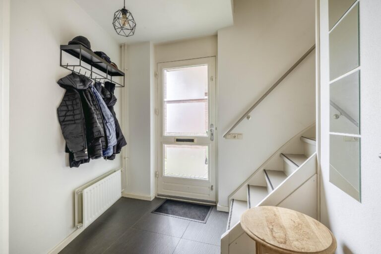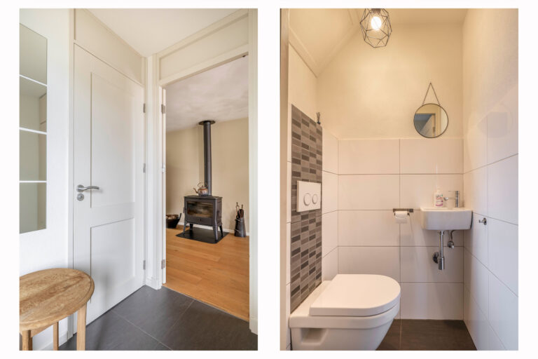 In de hal ligt een tegelvloer. Hier zijn de meterkast en het toilet met fonteintje aanwezig. De meterkast is uitgebreid t.b.v. de zonnepanelen en de oplader voor de auto.