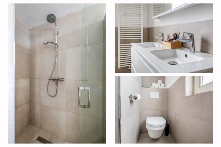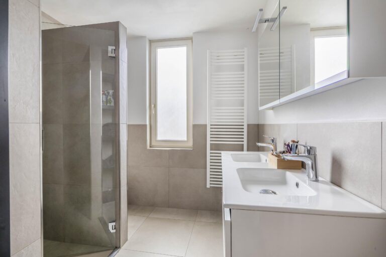 De moderne badkamer van 2019 beschikt over een dubbel wastafelmeubel, inloopdouche, toilet en designradiator. De ruimte is geheel betegeld en heeft een raam dat zorgt voor daglicht.