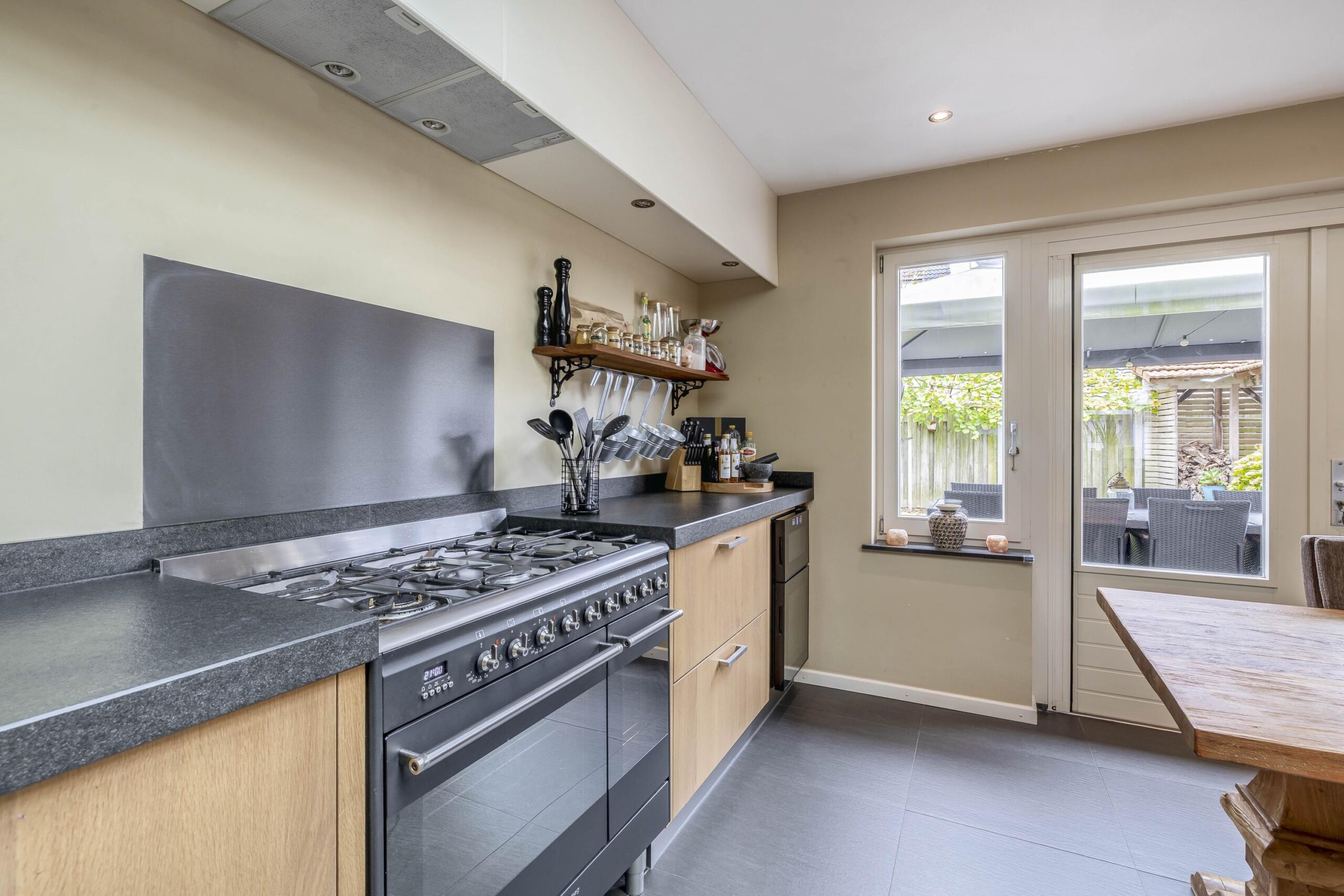 Aan het keukeneiland met veel kastruimte, de vaatwasmachine en spoelbak met quooker, is een gezellig zitje gemaakt. De werkbladen zijn van natuursteen. Verder beschikt de keuken over een koel/vriescombinatie, afzuigkap, oven/steamer, een wijnkoeler en een kooktoestel met twee ovens en een 6-pits gasfornuis.