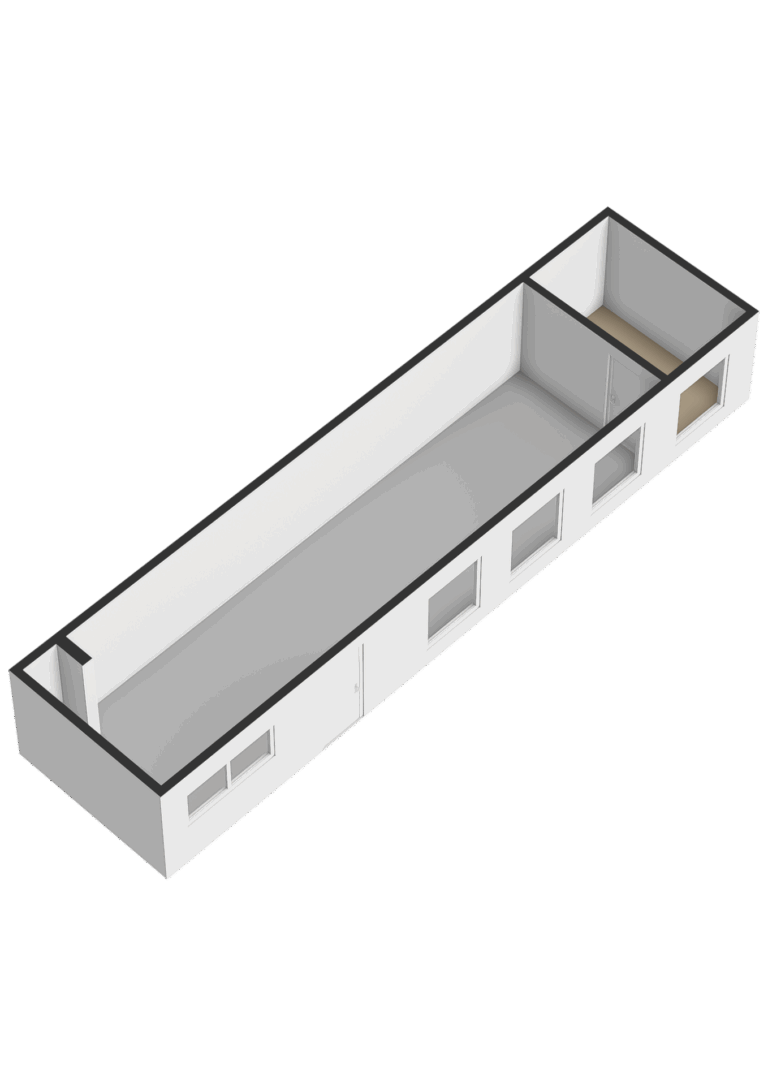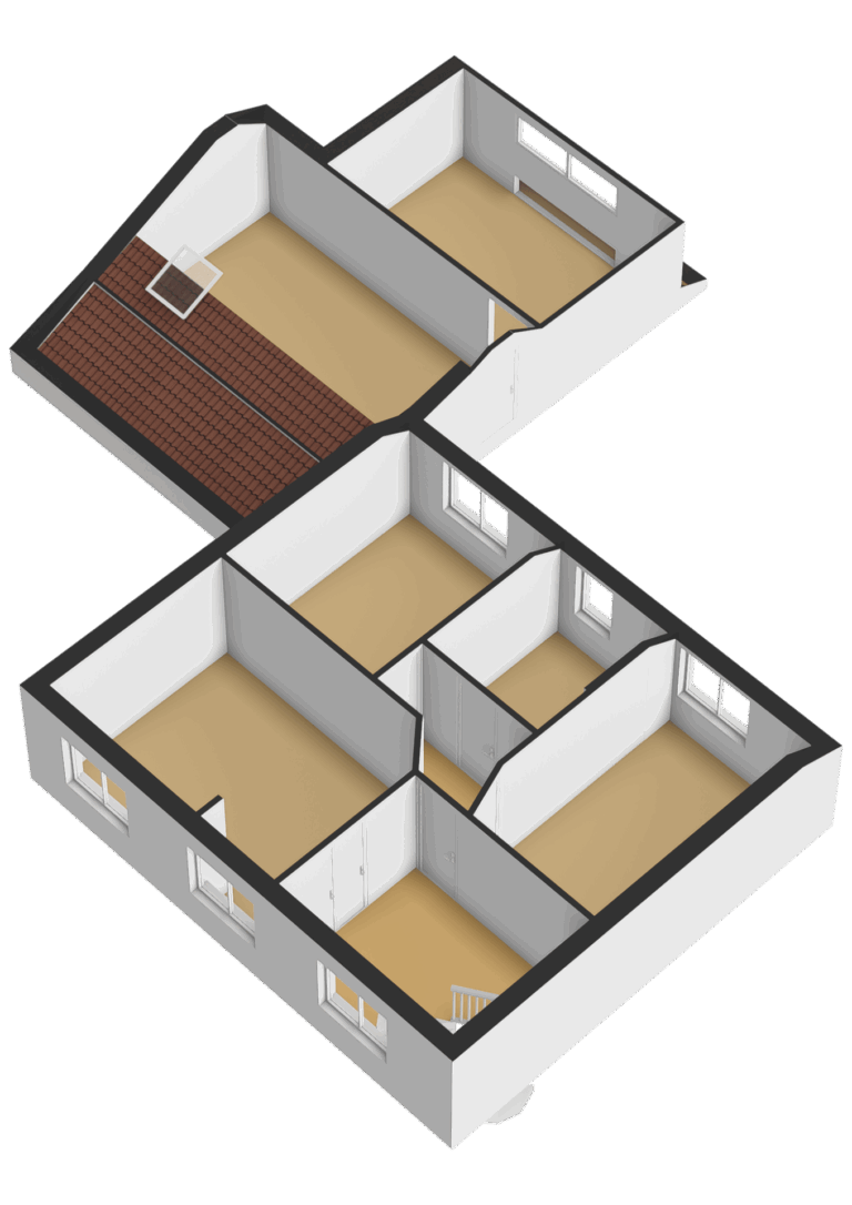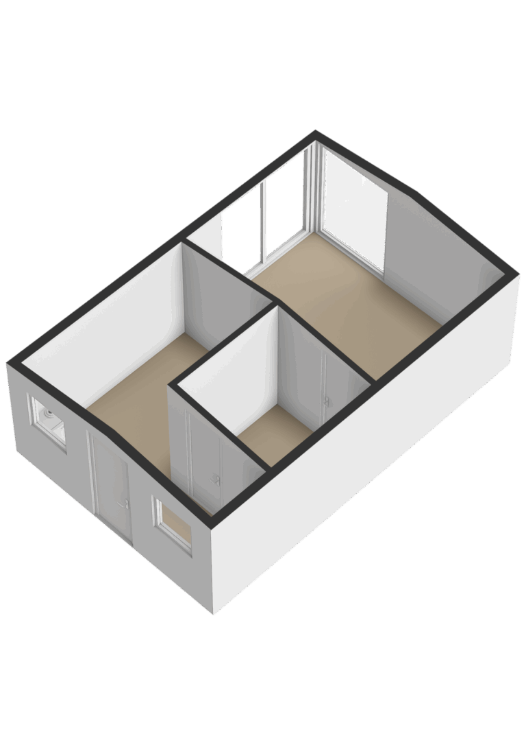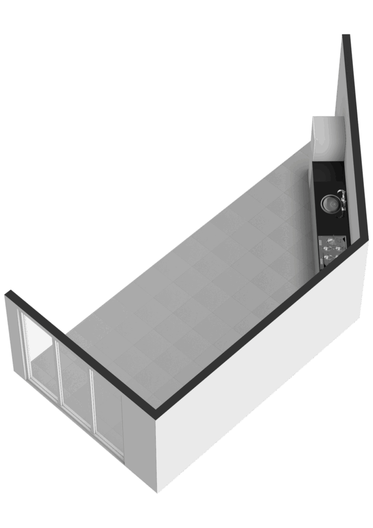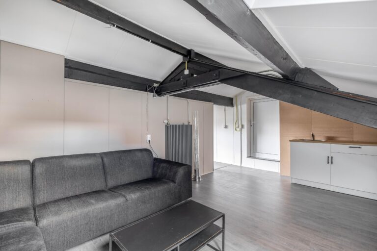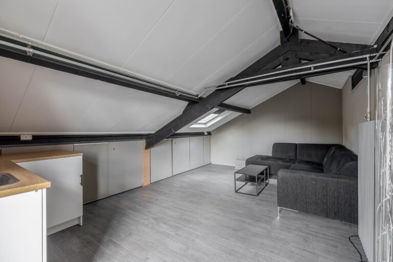 Via het dakterras is de studio/zolder bereikbaar. Deze is momenteel ingericht als woonkamer met keukenblok met koud water en een slaapkamer. Beide ruimtes zijn voorzien van een laminaatvloer en verwarming. Het raam aan de achterzijde is recent vervangen door een kunststof kozijn met dubbel glas.