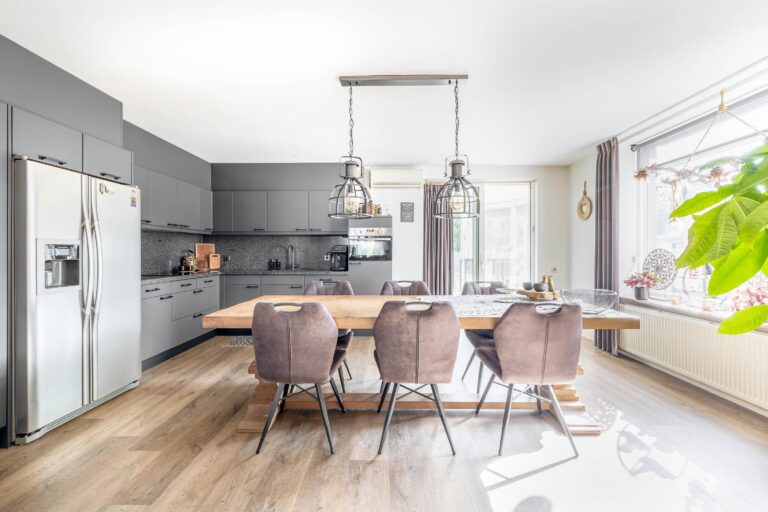 De woonkamer met open keuken is lekker ruim. In de woonkamer is een houtkachel aanwezig en in de open keuken is een airco aanwezig. De keuken is uitgerust met een inductiekookplaat, afzuigkap, combi oven/magnetron, vaatwasser en Amerikaanse koelkast met diepvries. De serre is voorzien van een tegelvloer en de witgoedaansluiting. Vanuit hier is er toegang tot de achtertuin.