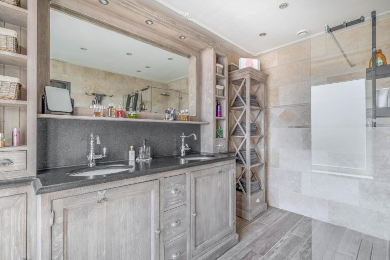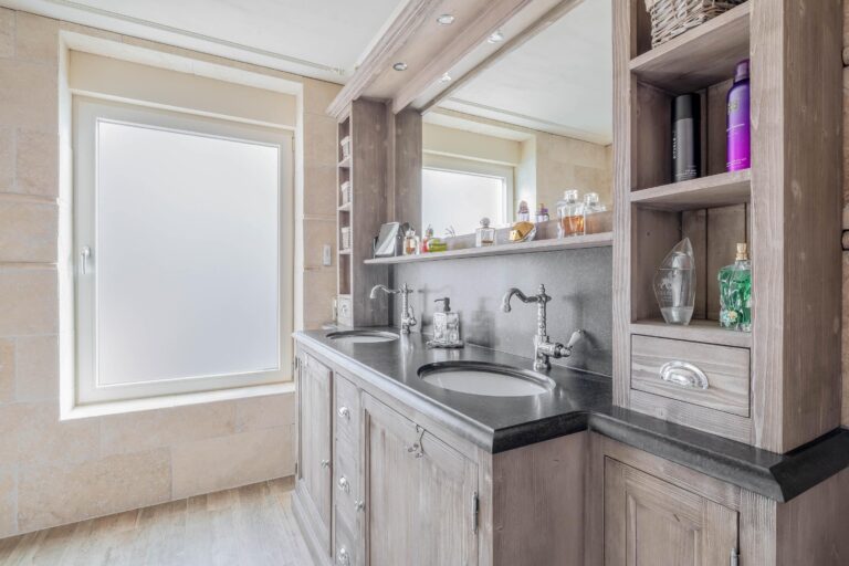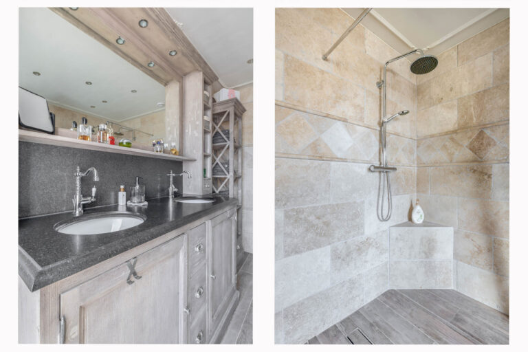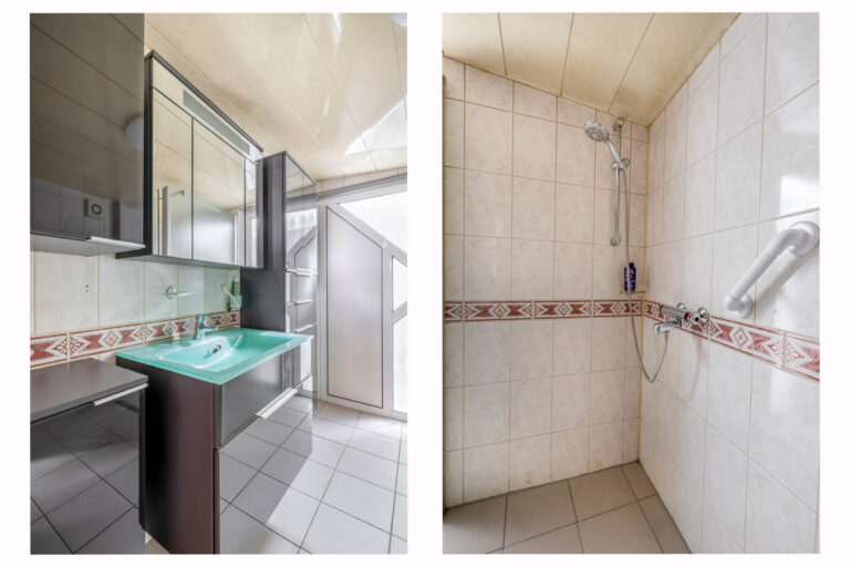 Een deur biedt, vanuit de woonkamer, toegang tot de badkamer. Deze is groot en voorzien van een inloopdouche en een meubel met dubbele wastafel. Het grote raam zorgt voor voldoende daglicht en natuurlijke ventilatie.