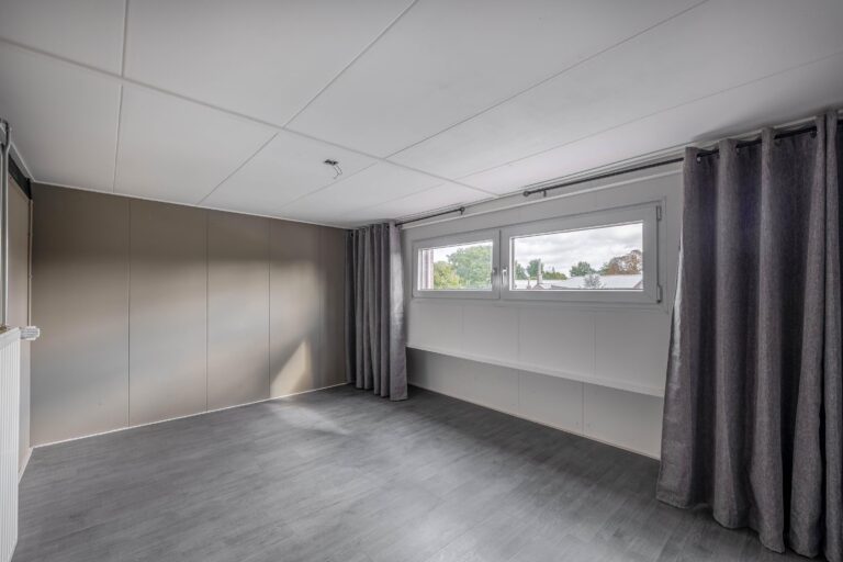 Een schuifpui biedt toegang tot de slaapkamer (linkerzijde), ook voorzien van airco en de badkamer (rechterzijde). De badkamer is geheel betegeld en voorzien van een inloopdouche, wastafelmeubel, toilet en de witgoedaansluiting.