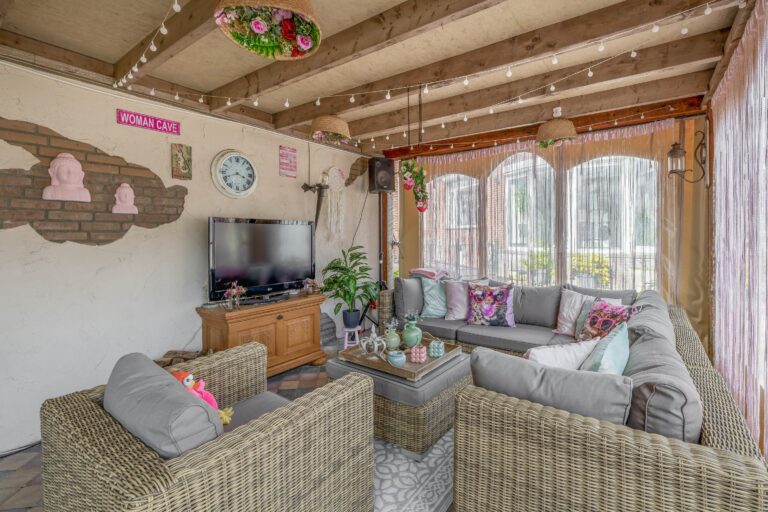 Naast de enorme woonruimte beschikt de woning over een aparte zolder/studio die bereikbaar is via het dakterras en een royale achtertuin met twee grote garages, een ruime werkplaats, twee houten tuinhuisjes en een overkapping. De brede oprit zorgt voor vrije toegang tot het eigen terrein.