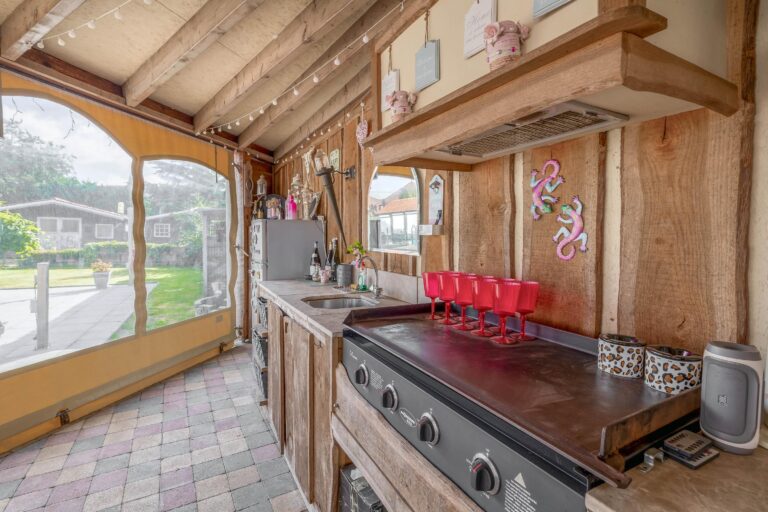 Je vindt hier onder andere twee garages met elektra, twee houten tuinhuisjes met elektra (waarvan er één is geïsoleerd en voorzien van water) én een grote werkplaats met elektra, vliering en een houtkachel. Daarnaast is er een overkapping met buitenkeuken voorzien van warm en koud water aanwezig.