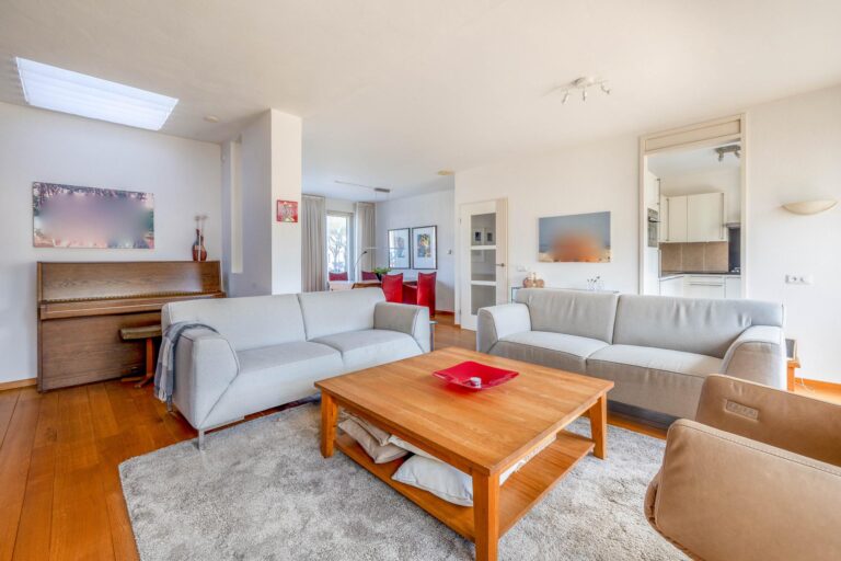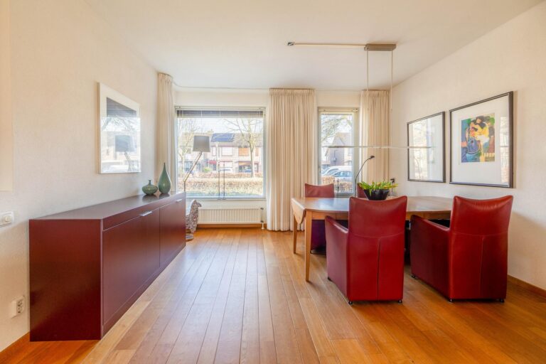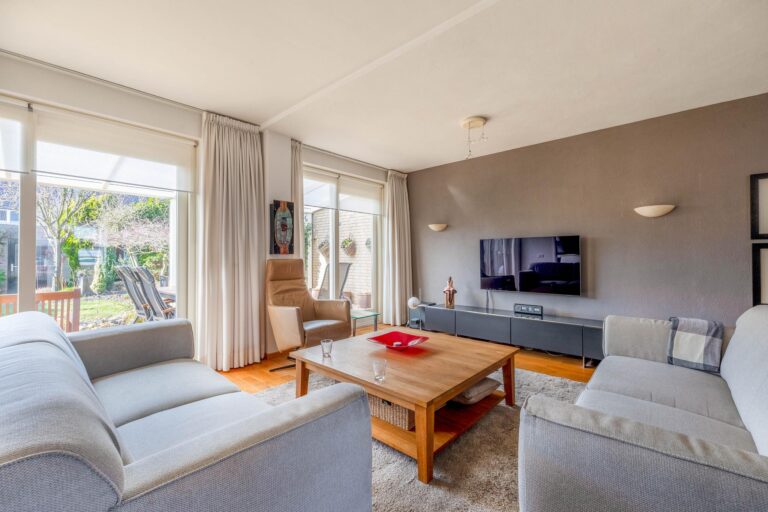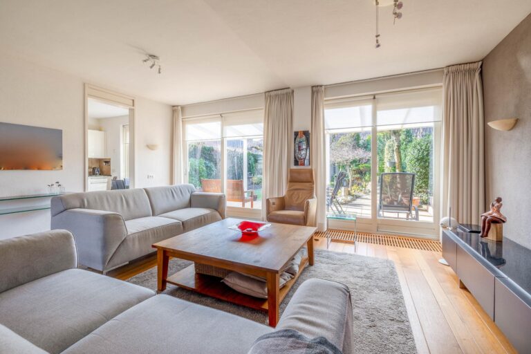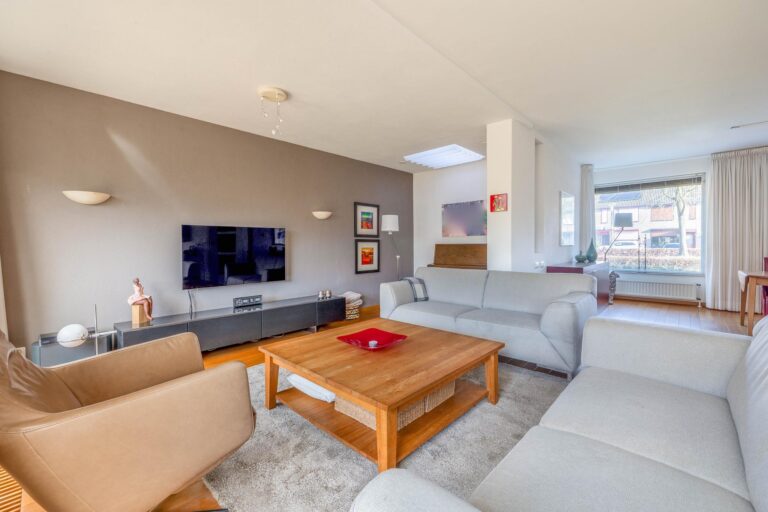 In de hal ligt een tegelvloer. Hier zijn een trapkast en het toilet met fonteintje aanwezig. De lichte en uitgebouwde woonkamer biedt veel ruimte (ca. 43m²) en is v.v. een parketvloer. Er zijn 2 schuifpuien (met convectorputten) richting de tuin aanwezig. Een lichtkoepel zorgt voor nog eens extra natuurlijke lichtinval.