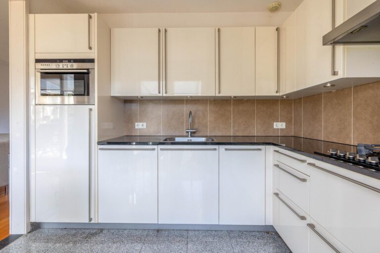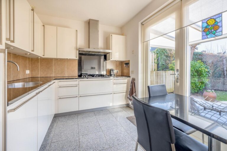 In de keuken (ca. 8m²) ligt een tegelvloer. De keuken is uitgerust met een koelkast, oven, vaatwasser, 5-pits gas op glas kookplaat en afzuigkap. Een loopdeur biedt toegang tot de achtertuin.