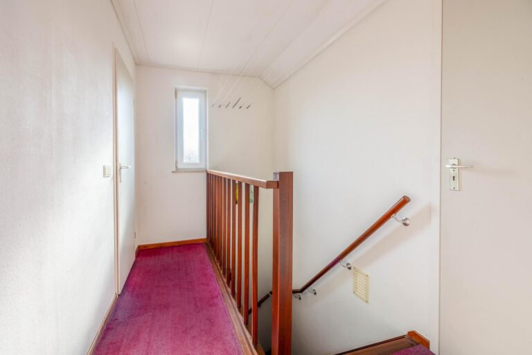De overloop is voorzien van vloerbedekking en biedt toegang tot de 3 slaapkamers (ca. 8m², 14m² en 15m²) en de badkamer.