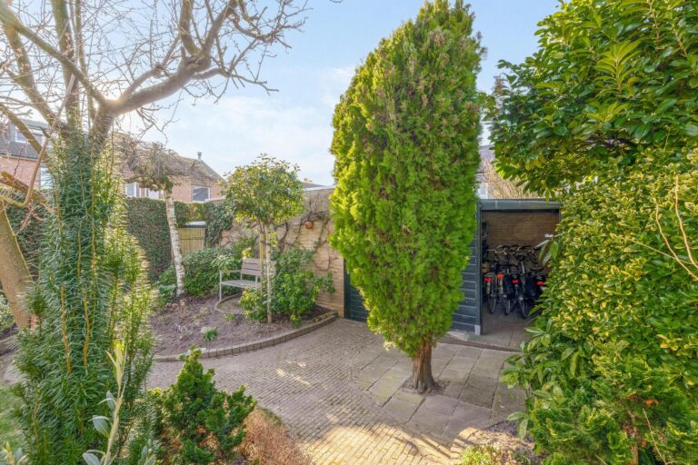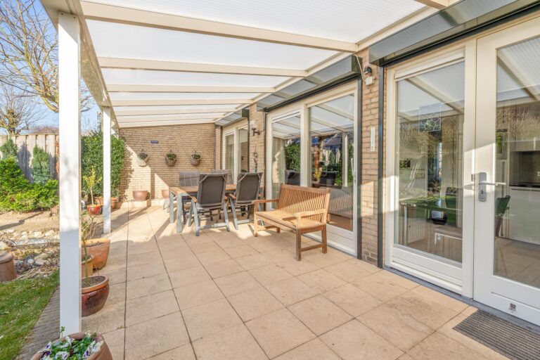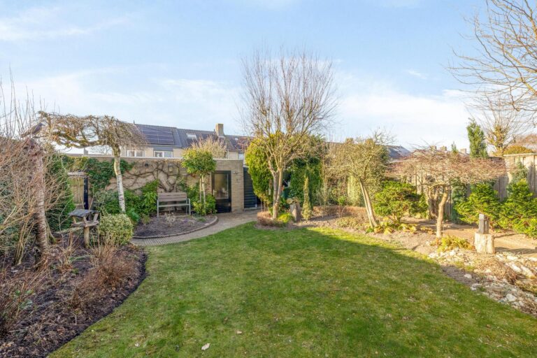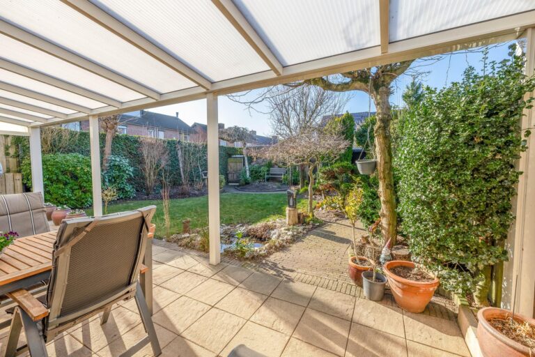 De heerlijk, rustige achtertuin is geheel omheind. Zowel aan de zijkant van de woning als achterin de tuin is een vrije achterom aanwezig. Onder de grote overkapping (ca. 27m²) is het heerlijk vertoeven. Er is een kleine vijver aanwezig.