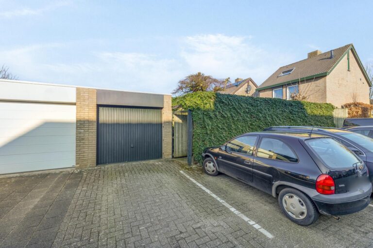 De vrijstaande stenen garage (ca. 17,5m²) is voorzien van elektra, een kantelpoort en een keukenblok. Naast de garage ligt nog een overkapping van ca. 9m², ideaal voor bijvoorbeeld het stallen van fietsen.