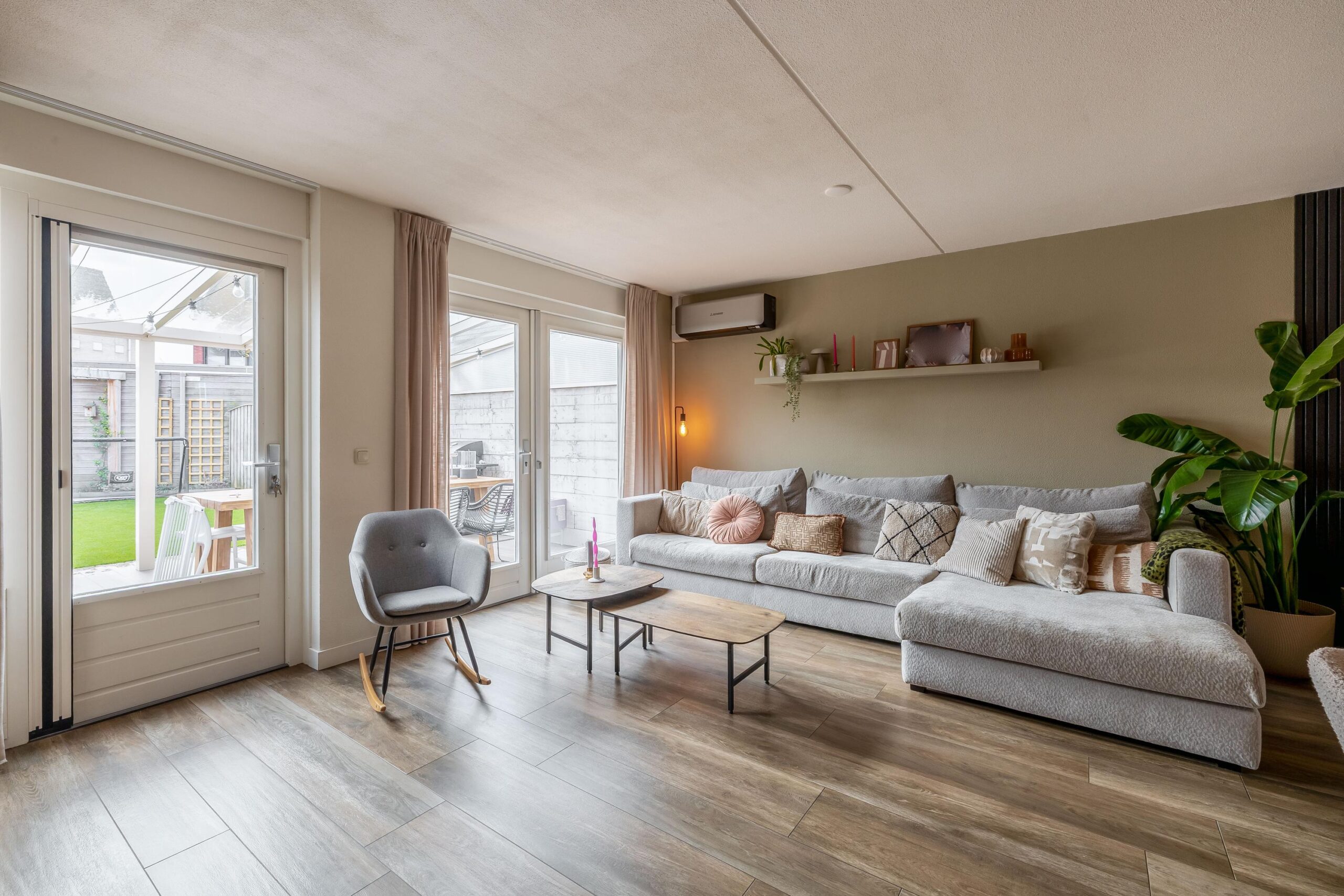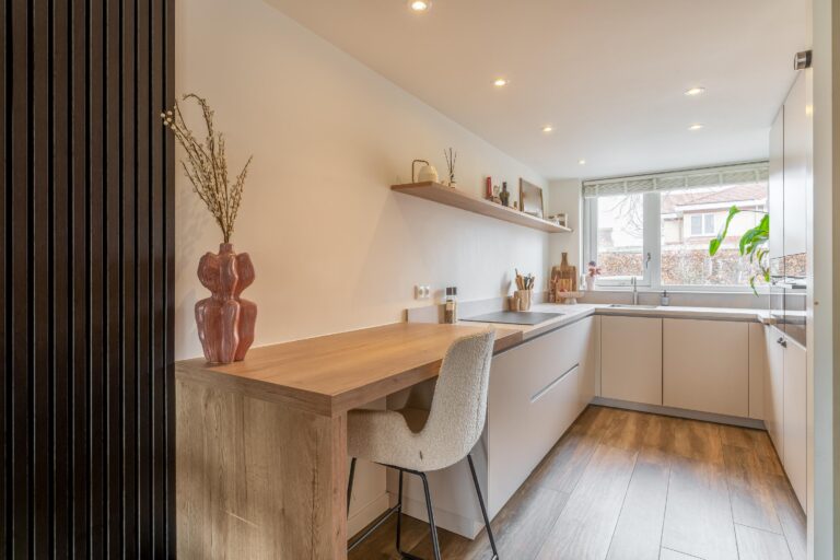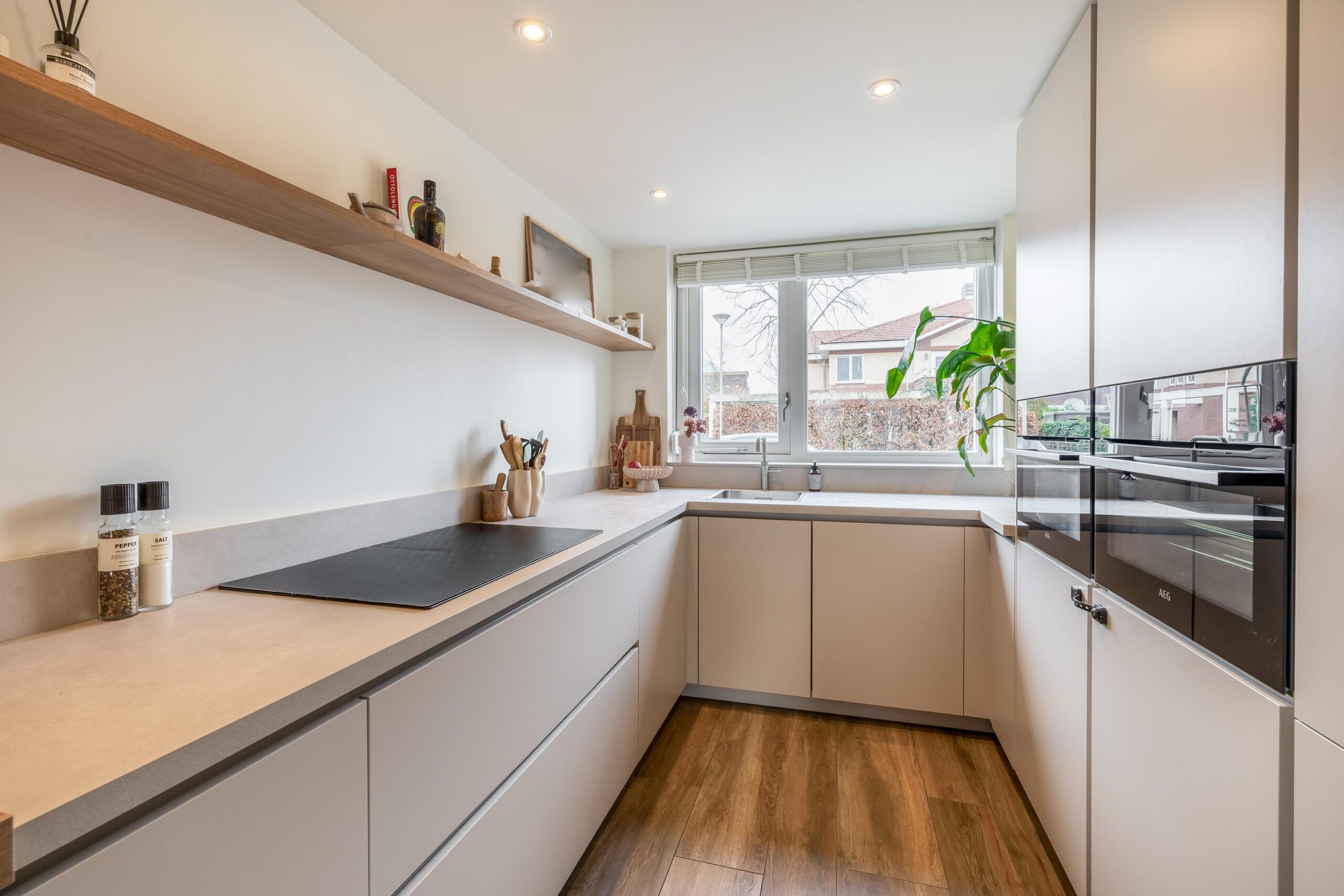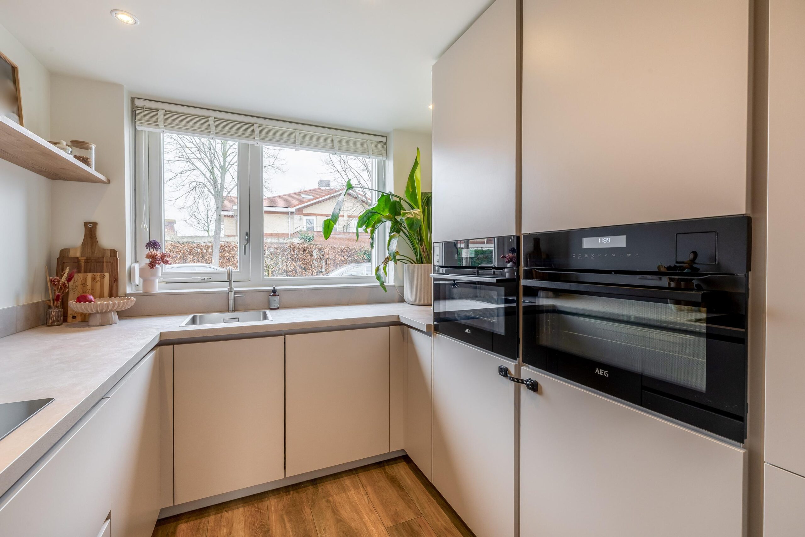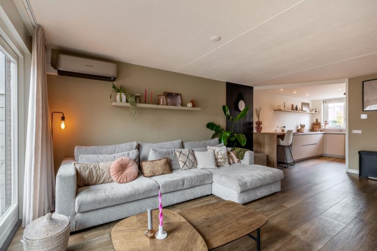 Bij binnenkomst kom je in de ruime hal met keramische tegelvloer welke toegang geeft tot de eerste verdieping, het toilet met fonteintje, een praktische bergkast en de woonkamer. De lichte en ruime woonkamer vormt een heerlijke leefruimte waar je comfortabel met het gezin kunt ontspannen. De moderne zandkleurige keuken uit 2024 sluit hier mooi op aan en is van alle gemakken voorzien. Zo beschikt de keuken over een inductiekookplaat met geïntegreerde afzuiging, een Quooker, stoomoven, combi-oven, vaatwasser, koelkast en een aparte vriezer. Alle apparatuur is van het merk AEG. Aan het gezellige barretje met houtlook, dat naadloos aansluit op de keuken, kun je ’s ochtends rustig de dag beginnen. De gehele begane grond is voorzien van vloerverwarming en in de woonkamer zorgt een airco voor extra comfort.